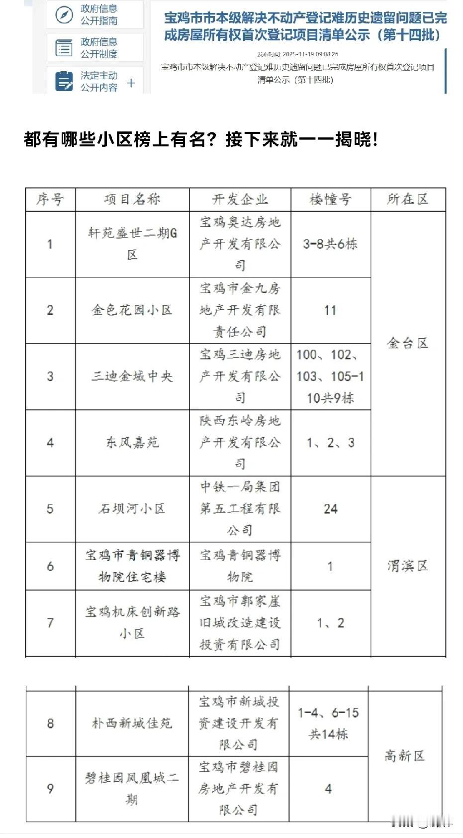 重磅!宝鸡这个9小区 “房本办理” 难题已解,有你家吗? 最新公布了一批已完成房屋所有权首次登记的项目名单,这可是拿到"红本本"最关键的第一步。 市自然资源和规划局公示了一批不动产登记难历史遗留问题已完成房屋所有权首次登记项目清单,本次公示涉及9个小区。