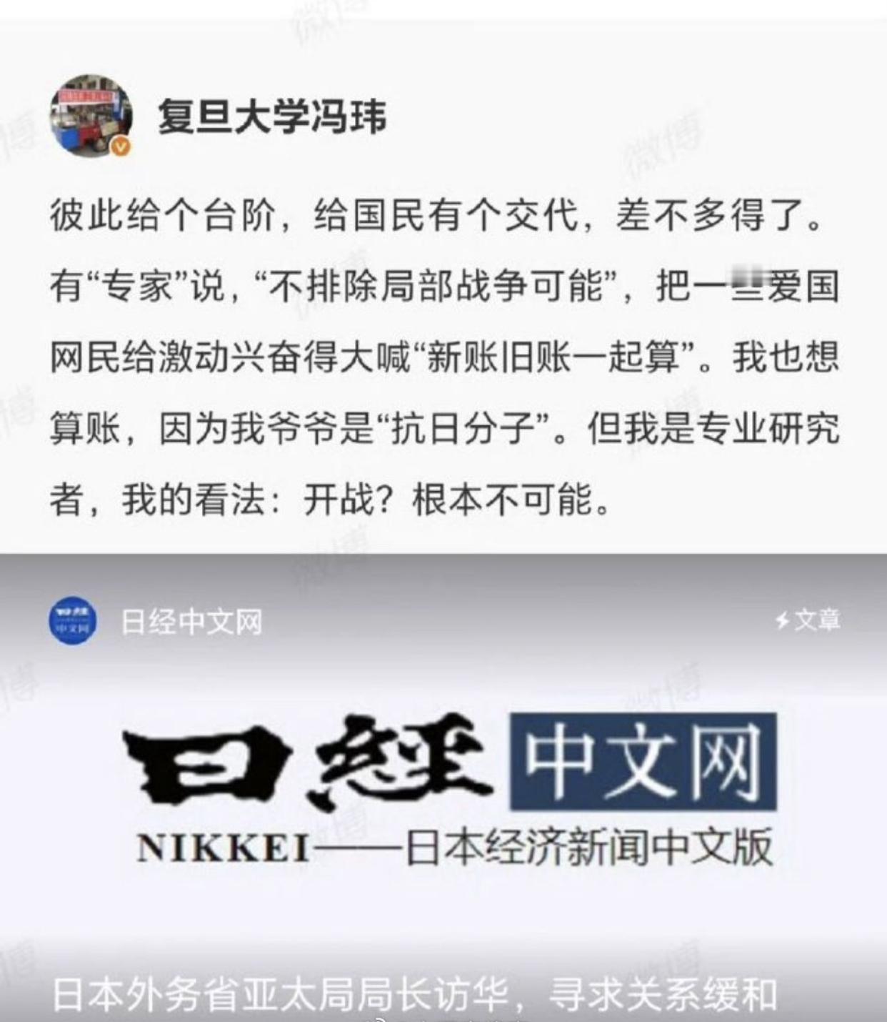 复旦大学冯玮发文表示:他的看法,中日开战根本不可能,双方闹了那么久,彼此给对方一个台阶,给国民有个交代,差不多就得了。有“专家”称,“不排除局部战争可能”,把一些爱国网民给激动得兴奋的大喊大叫“新仇旧恨一起算”,他也想算帐,因为他爷爷是“抗日分子”。 “抗日分子”是不是有歧义?这位冯老师跟老胡一样也就只会在国内劝说中国人算了,不要跟日本人斤斤计,你怎么不去跟日本人这样说,日本人会搭理你吗?
