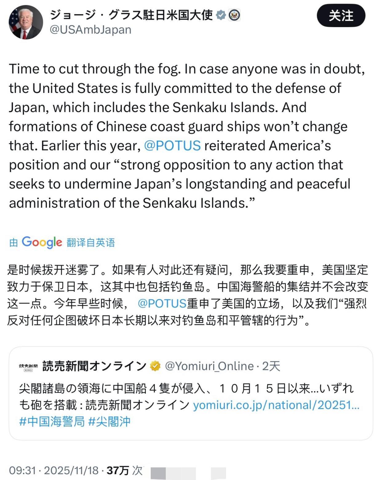 美国驻日大使表示:为了抵消质疑,他再次发文重申,美国坚定致力于保护日本,这其中也包括钓鱼岛,即使中国海警船经常出现在那里,也不会改变美国的立场。