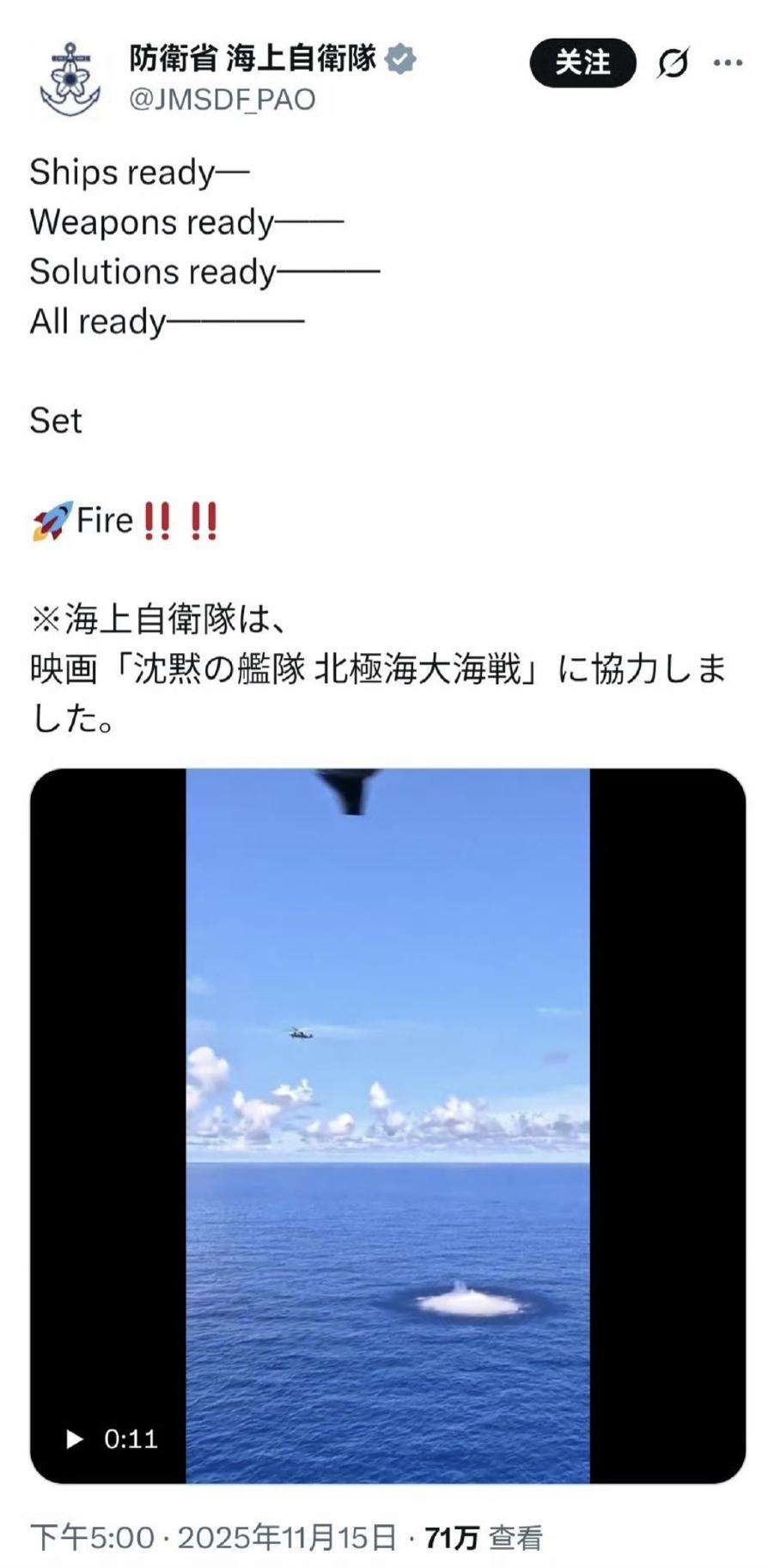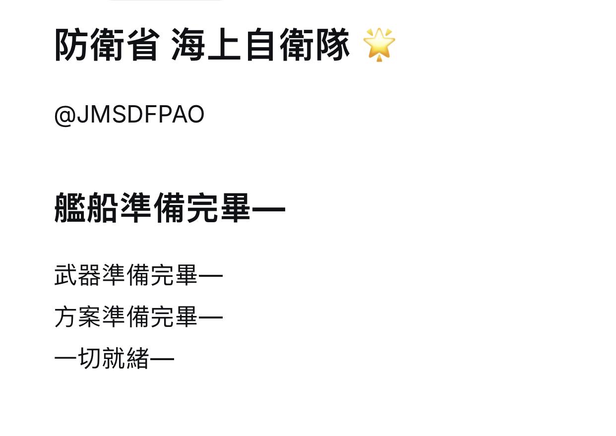 日本防卫省海上自卫队发布视频并配文称:“舰船准备完毕!武器准备完毕!方案准备完毕