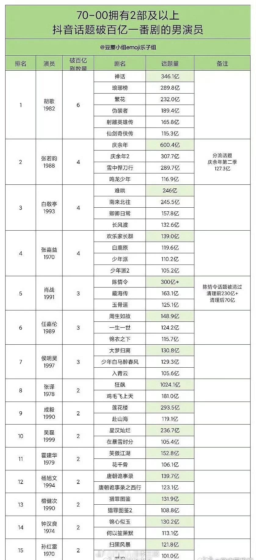 70-00🫘话题破百亿一番男女演员女演员Top1:杨紫8部男演员Top1 :胡歌6部