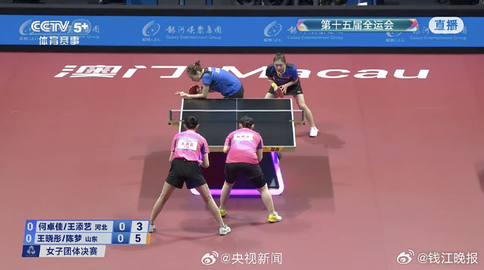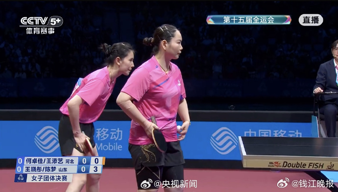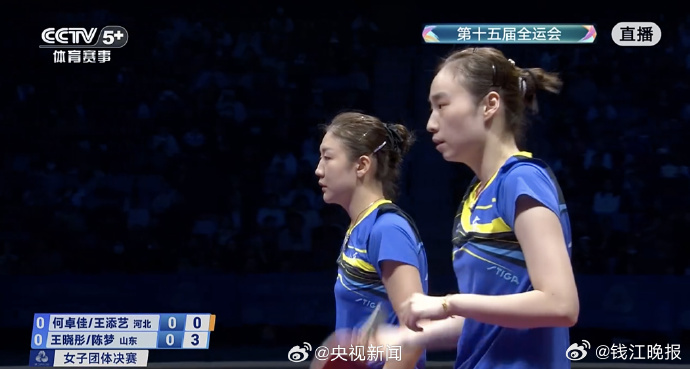 乒乓球女团金牌赛, 、 、 所在的山东队,3-2战胜 、 、王添艺代表的河北队,夺得冠军!第一盘:何卓佳/王添艺0-3王晓彤/陈梦【8-11、7-11、5-11】第二盘:孙颖莎3-1范思琦【11-5、11-9、10-12、11-5】第三盘:王添艺0-3陈梦【8-11、7-11、6-11】第四盘:孙颖莎3-0王晓彤【11-2、11-4、11-7】第五盘:何卓佳2-3范思琦 【11-6、11-4、6-11、7-11、6-11】 (央视新闻)