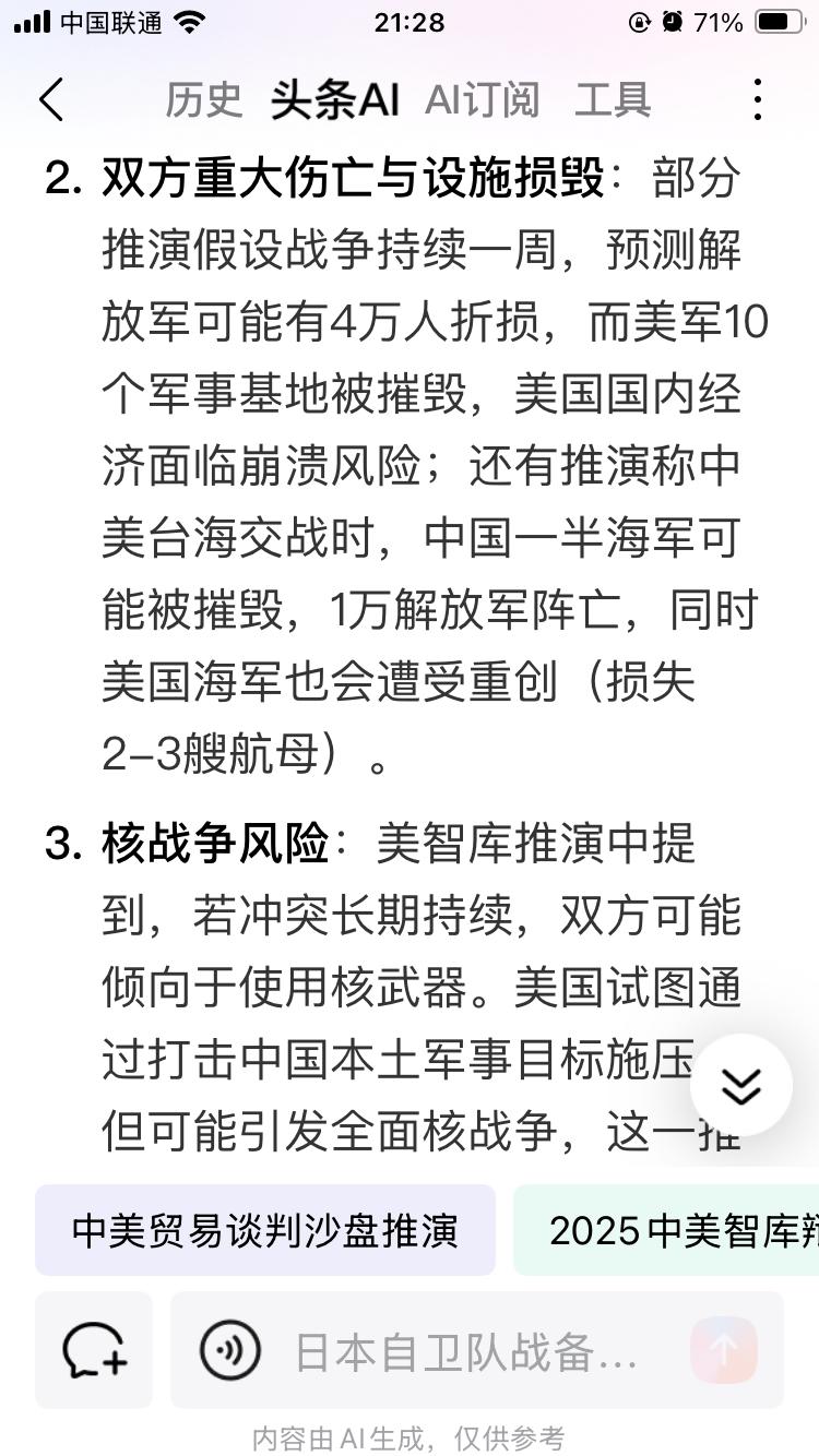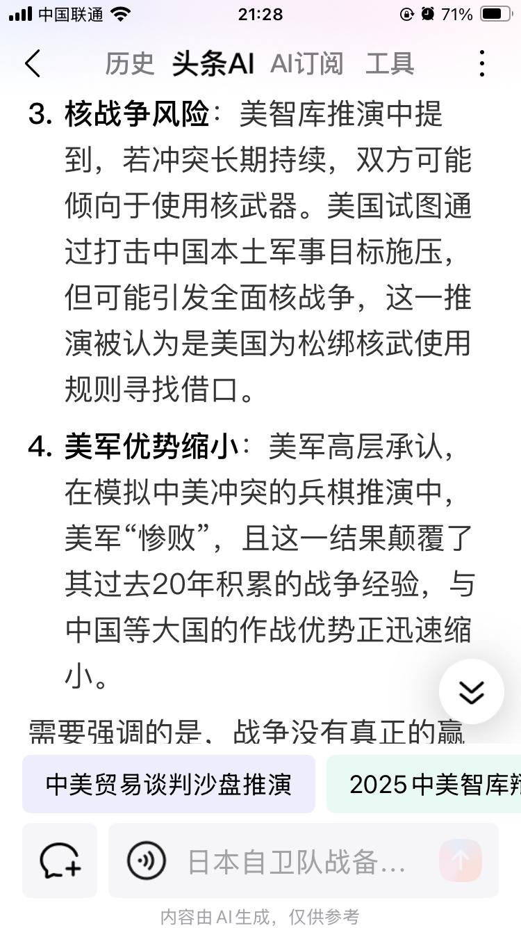 老美在西太平洋已经对我们做了几十次的军事演习推演,不管是强是弱,他们没有几次出比较舒服的,结果都是非常惨痛。 最近两次不一样,我们强大了很多。他们有了新的策略,他们认为如果东亚大乱战除了朝鲜可能会加入到东大这一边,其他的不会给他们有任何帮助。但是老美可以联合菲律宾,韩国越南,可以牵制住东方大国的行动。 最重要最重要的一员,印度!可以给东大的后院来一个出其不意,这是致胜的法宝。 看来不可以对他们掉以轻心。印度有能力有野心也有这个意愿。