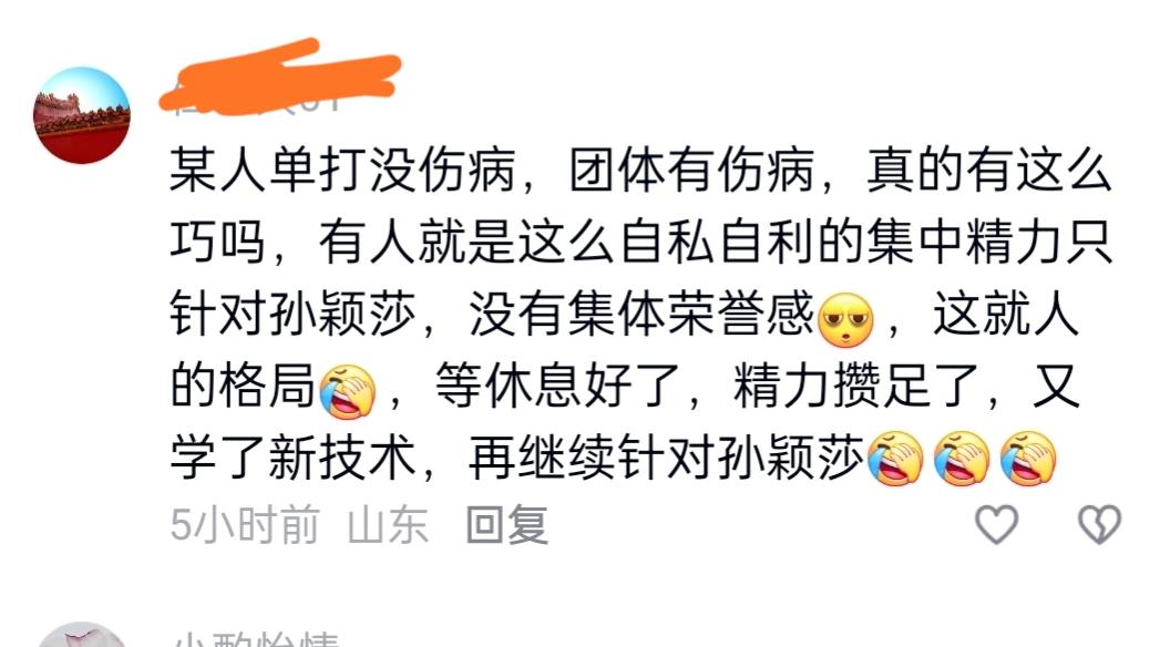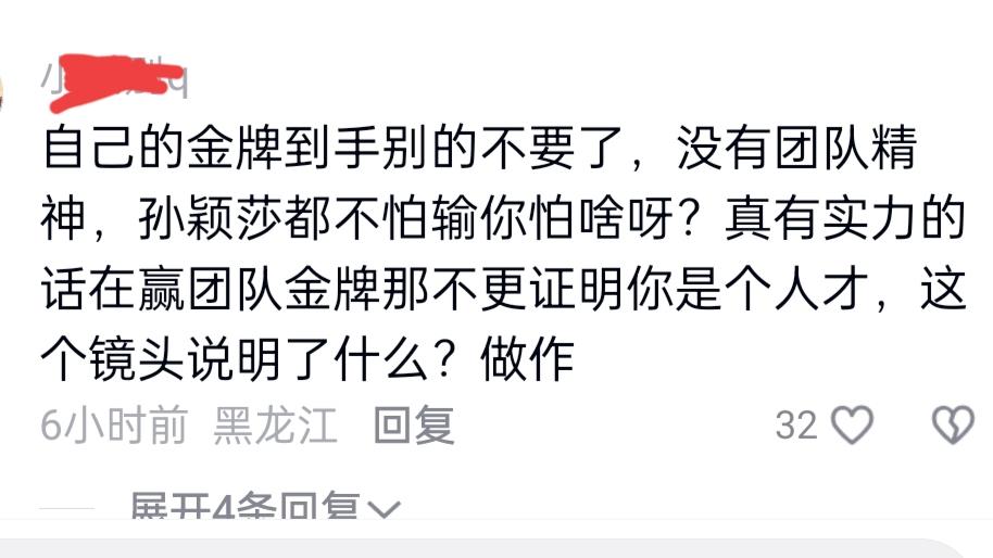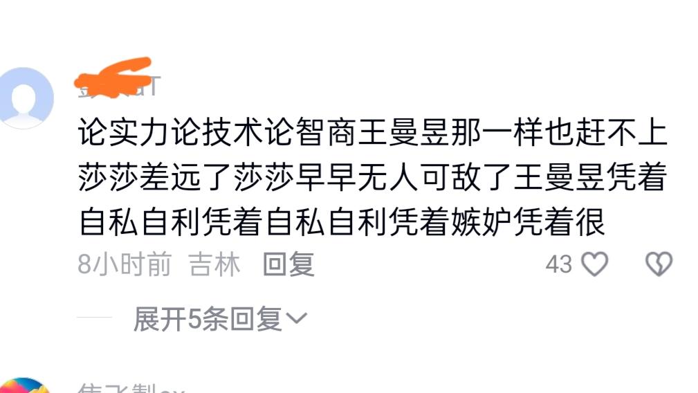 莎粉对曼昱极高的评论: 一、实力、技术、智商、曼昱赶不上莎莎,莎莎已经是无人可敌,曼昱凭着自私自利凭着嫉妒恨。 二、曼昱没有团队精神,团体赛受伤。个人做作。 看到这评论如鲠在喉,不吐不快:都是为国争光争荣誉的运动员,喜欢谁是你的自由,曼昱赢了,你贬损谩骂她有意思吗?曼昱招惹你了?到你家蹭饭吃还是蹭水喝? 莎莎很优秀,却被黑粉、资本、CP摁住了灵气,二届奥运会2:4输给陈梦。二次全运会0:4和2:4输给曼昱。难道这就是无人可敌? 莎的黑粉明为莎莎加油打气,实则把莎莎压的失去自我。莎莎和曼昱决赛我看到最后,莎莎仿佛千斤重担压肩上,曼昱坦然自若。试想背负重担和轻装上阵的人哪个更容易取胜? 曼昱和莎莎站在领奖台上,裁判颁奖给曼昱,莎粉喊:‘’孙颖莎你最棒!‘’犹如在打莎莎的脸,夺金牌靠的是实力。