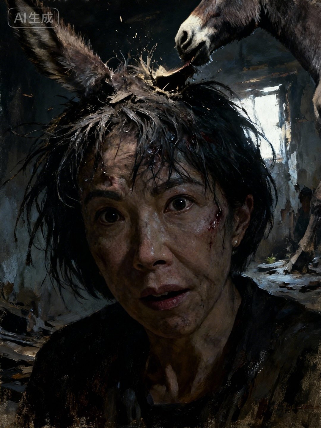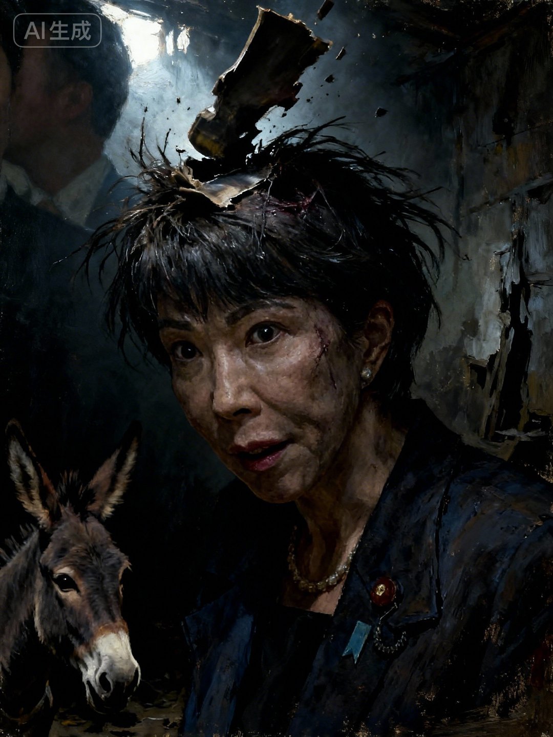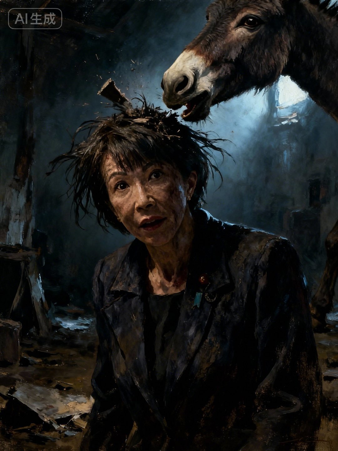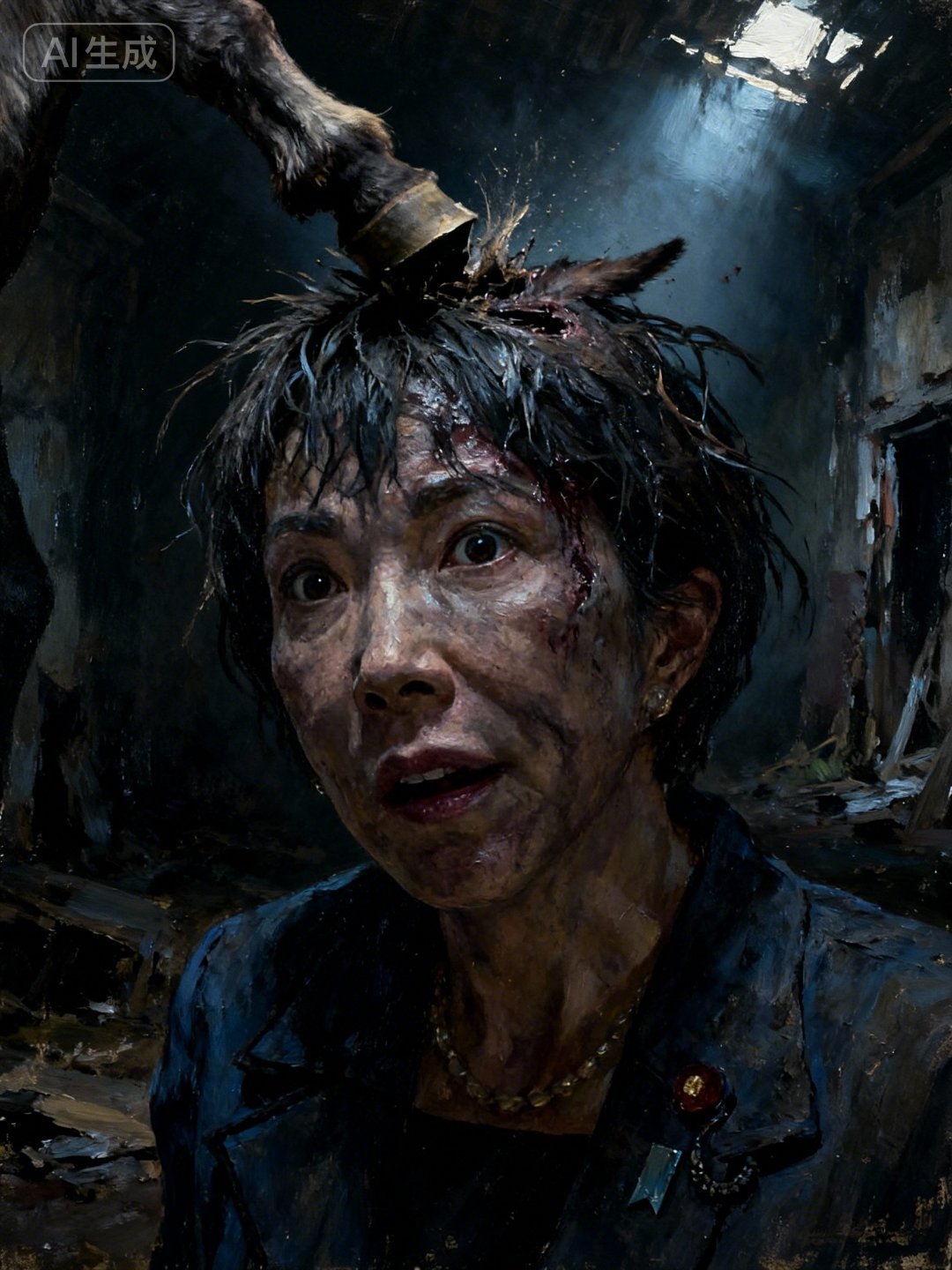 用即梦AI生成高市早苗的图画,提示词是:写实油画风格,描绘一个女人,脑袋被驴踢了,也不知道撒泡尿照照自己。神情恍惚,周围光线昏暗,阴影浓重,笔触细腻地勾勒出女人凌乱的发丝、惊慌的眼神以及周围破旧而压抑的环境。结果出来就是这个效果