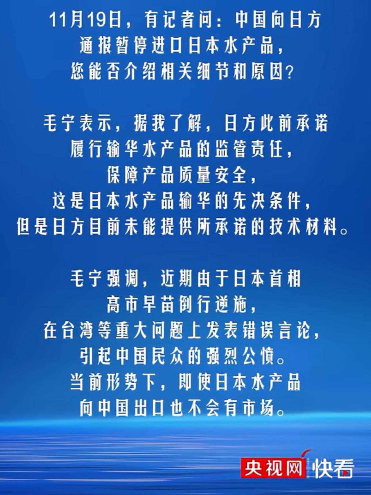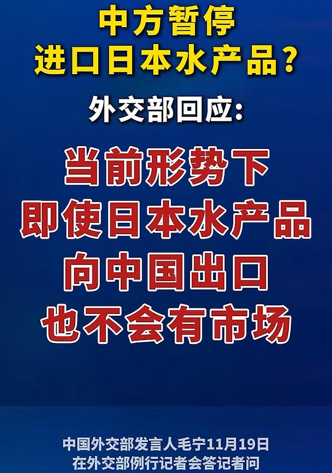 大家看看反制,这不就一步一步升级了吗!所以说大家不要着急。 之前还有人嘲讽“闹半天还得进口日本水产”,现在看看?中方直接暂停日本水产品进口,精准戳中七寸!这哪是一时冲动,分明是步步为营的精准打击。 高市早苗敢乱喷涉台言论,就得扛得住后果。要知道日本水产对华依赖度有多高,之前核污染水排海时的禁令,让他们损失上千亿日元,现在刚恢复没多久又被叫停,渔民哭都来不及。 真正的反制从不是一上来就掀桌子,而是慢慢收紧套索。现在只是水产,后续稀土、旅游这些日本离不开的领域,有的是办法让他们疼。优势在咱们这,耗得起也打得准。 就盼着日本右翼别怂,硬到底才好,咱们慢慢算总账!你觉得下一波反制会瞄准哪个领域?来评论区聊聊!