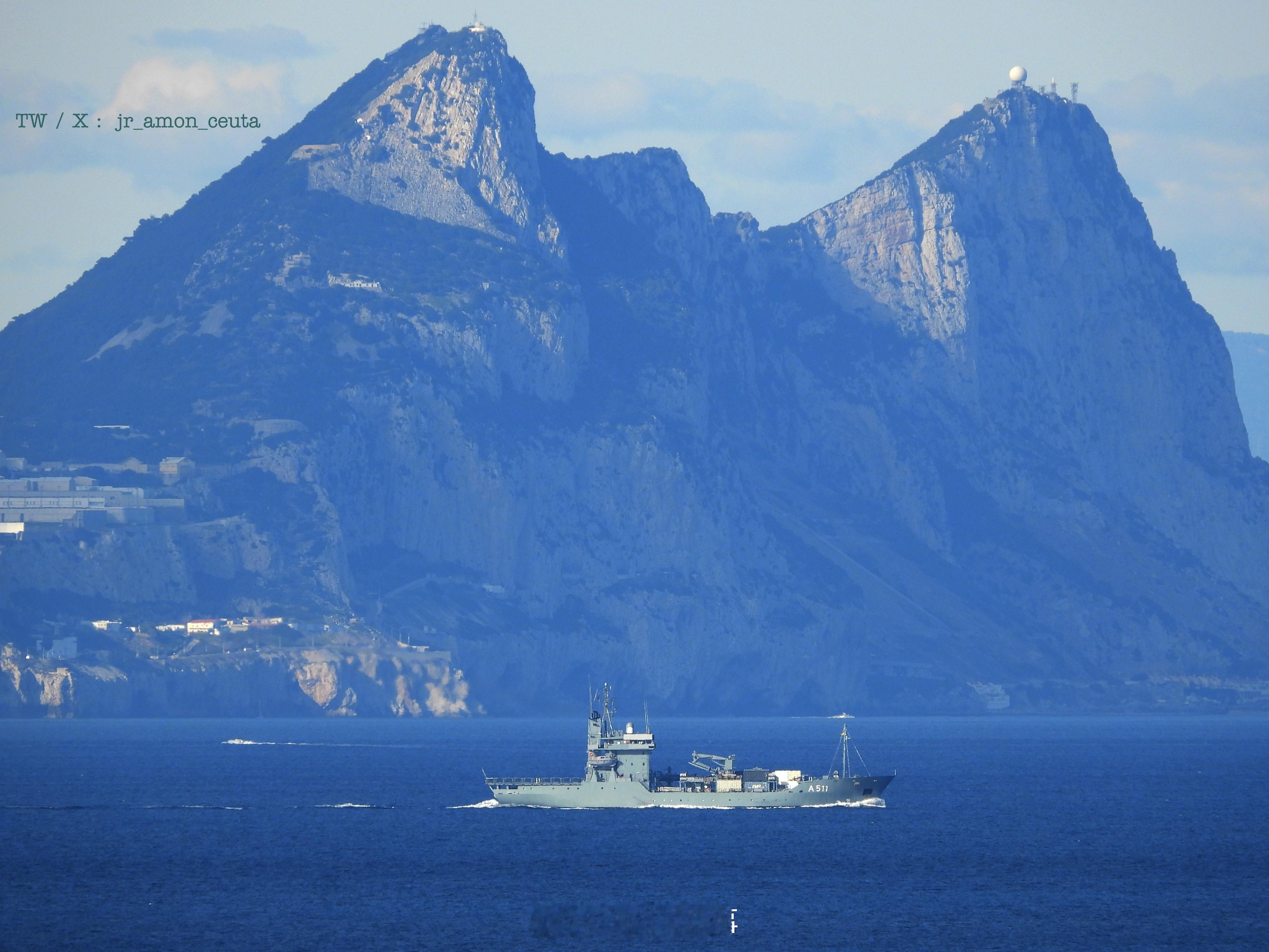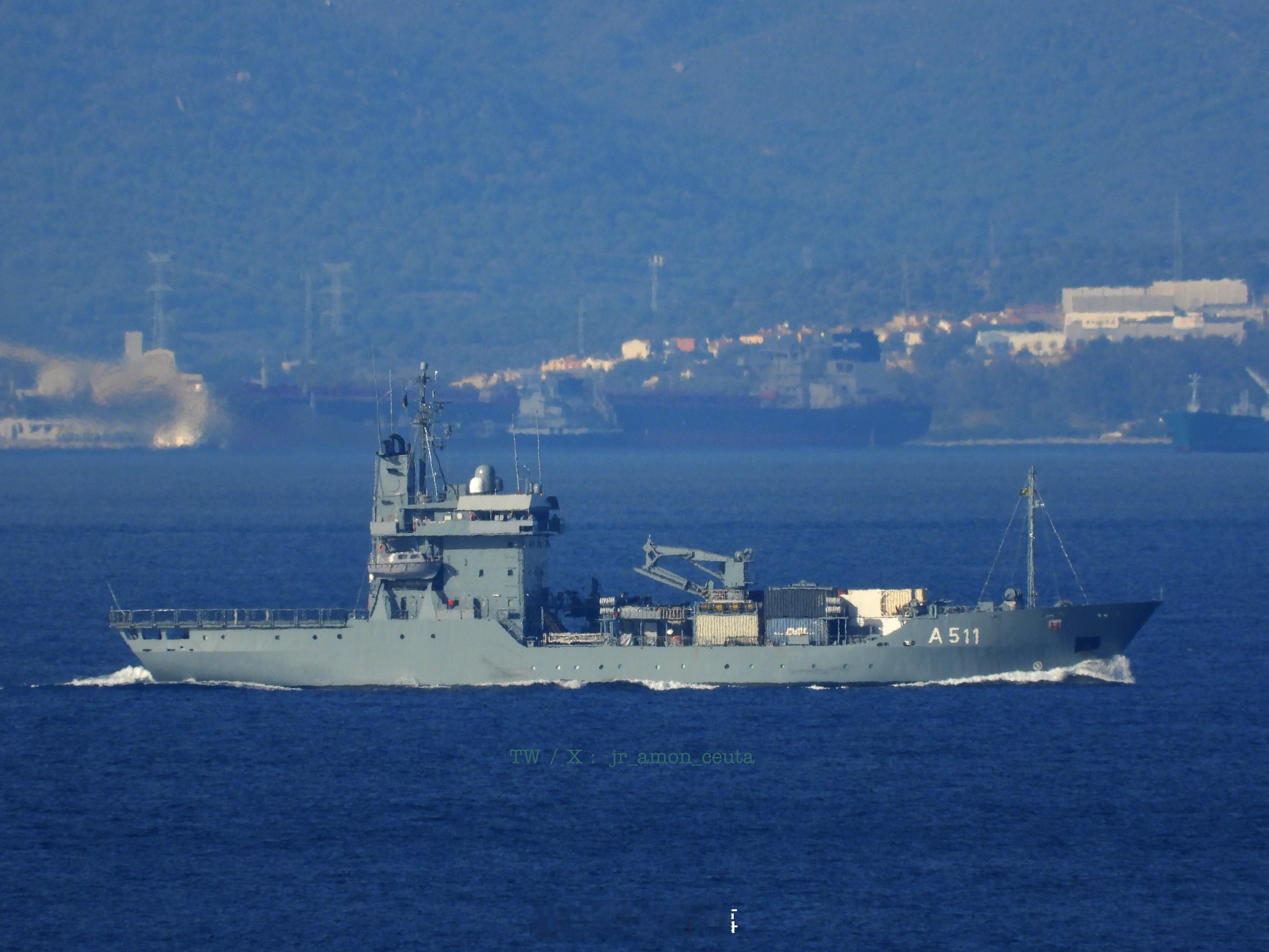 2025 年 11 月 19 日德国海军易北河级补给舰“易北河”号(FGS Elbe,舷号 A511)正向东穿过直布罗陀海峡