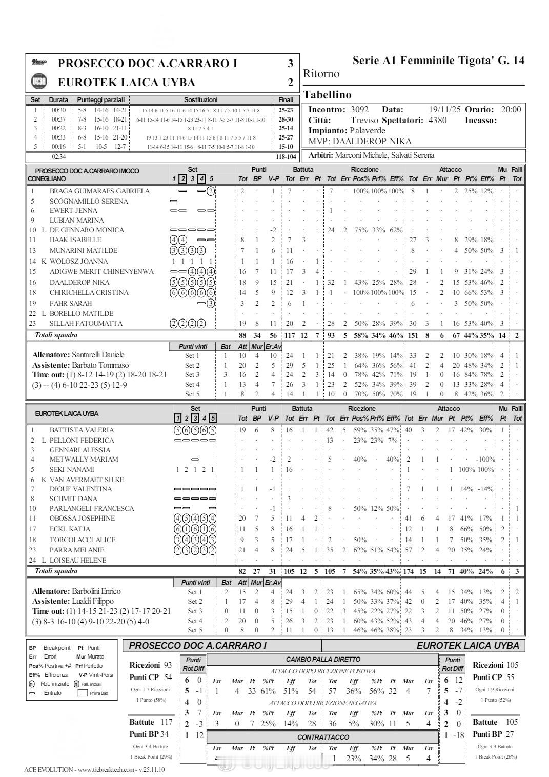 【意甲女排科内3-2布斯托 艰难取得12连胜】 11月19日特雷维索,意甲女排第14轮由于世俱杯的缘故,卫冕冠军科内利亚诺的比赛提前进行。以替补主打的领头羊在主场经过两个半小时的鏖战,才以3-2(25-23/28-30/25-14/25-27/15-10)艰难战胜布斯托阿斯奇奥,取得12连胜。西拉19分、MVP达尔德罗普18分、阿迪维16分、奇里切拉14分,帕拉21分、奥博萨20分、巴蒂斯塔19分、埃克尔11分。