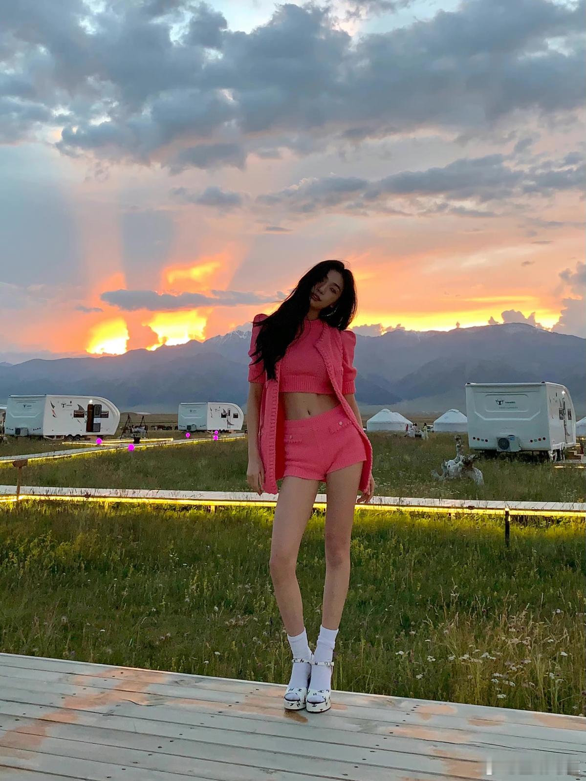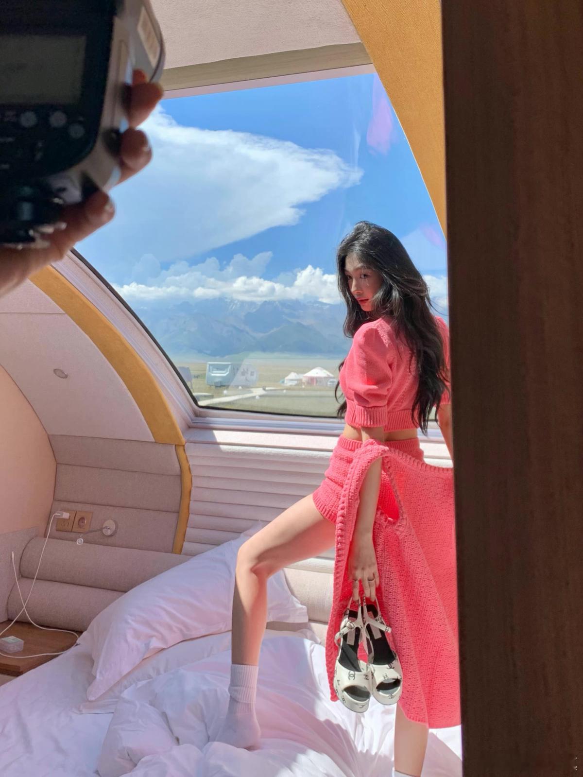 乔欣黑色吊带一字肩偏开纱裙红毯摆拍生图