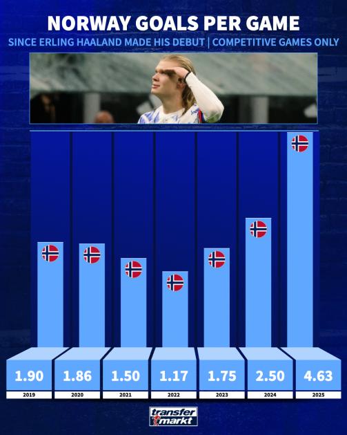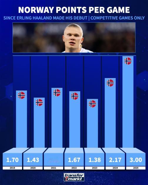 你不得不承认哈兰德是挪威队时隔27年后重返世界杯舞台最大的功臣!截至目前,他已经在48场国家队的比赛中打进了55球,本次预选赛更是在8场比赛中打进了16球!正是因为他的出色发挥挪威才能够以八场全胜且净胜球+32的成绩成功晋级世界杯!当我们回顾哈兰德在国家队的出场轨迹时,很容易就能发现他的进球对挪威队的成功有多大影响! 下图中第一个表是哈兰德在2019年对阵马耳他的比赛首次亮相以来,挪威队每年的场均进球数。哈兰德为挪威出战的前三年球队场均进球数变化并不大,到2022年甚至出现了下降,但那之后这个数字每年都在提升!正如我们看到的,2025年挪威队平均每场比赛打入4.63个进球,去年的场均2.5个进球也是过去15年挪威队第二好的数据,自从哈兰德首次代表挪威队出场以来,挪威队场均进球1.88个,比此前七年的场均进球数增加了24%。 不出所料,哈兰德的进球也帮助挪威在场均积分方面取得了长足进步!挪威队2025年场均3分的完美表现也远远超过了哈兰德为国家队效力的前几年!2024年平均每场2.17分也是过去15年挪威队第三好的成绩。自从首次亮相以来,哈兰德只输了三场欧洲预选赛,三场国家联赛和38场世界杯预选赛中的一场。因此,比起哈兰德首次亮相七年之前,挪威队场均得分从1.3上升到了2.19,增长了令人难以置信的68%。这就很好的解释了为什么哈兰德是这支挪威队的领军人物!