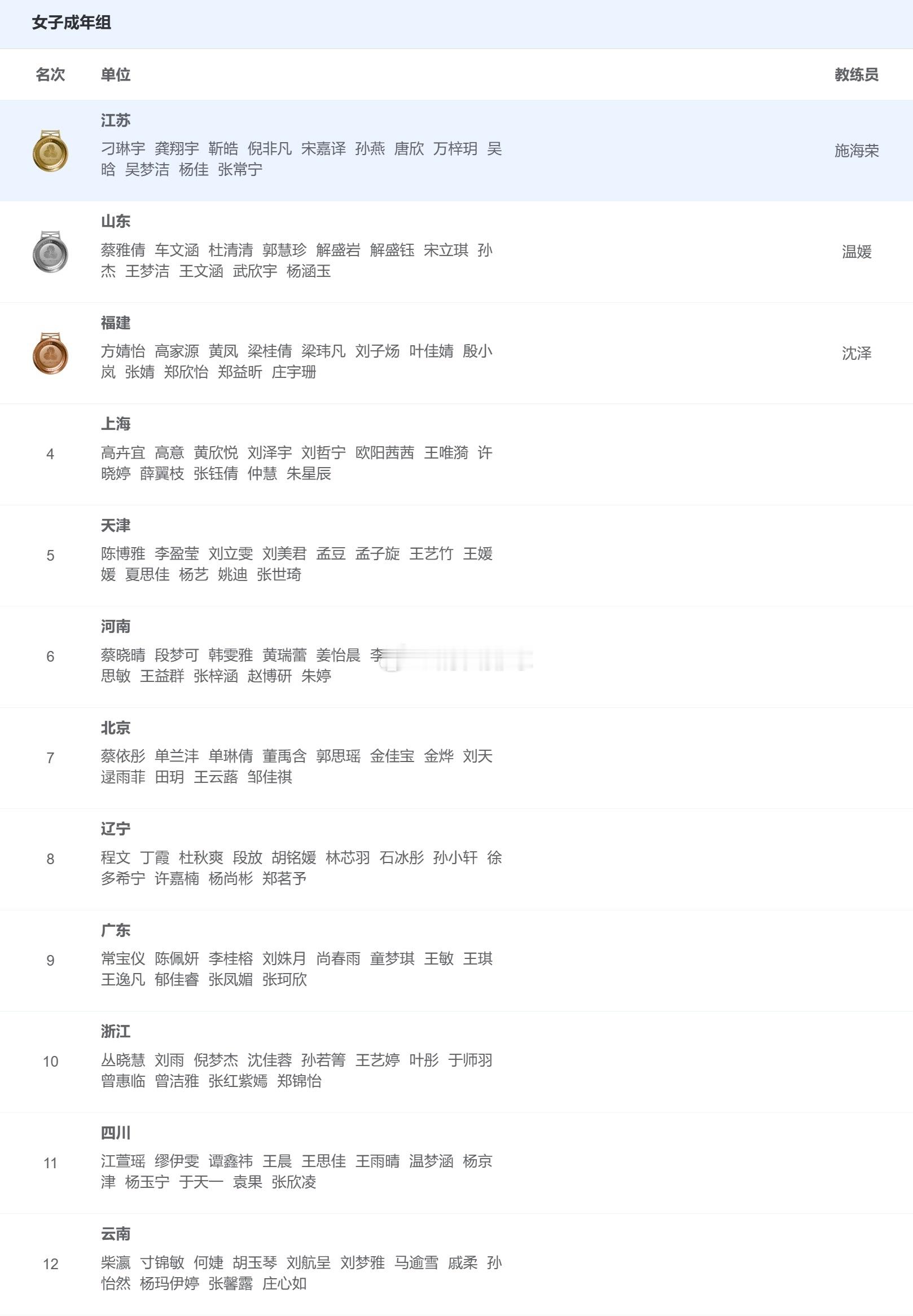 2025年第十五届全运会女排成年组完全排名冠军🥇:江苏(2)亚军🥈:山东(5)季军🥉:福建(9)第四名:上海(4)第五名:天津(1)第六名:河南(7)第七名:北京(11)第八名:辽宁(3)第九名:广东(6)第十名:浙江(8)第十一名:四川(10)第十二名:云南(12)