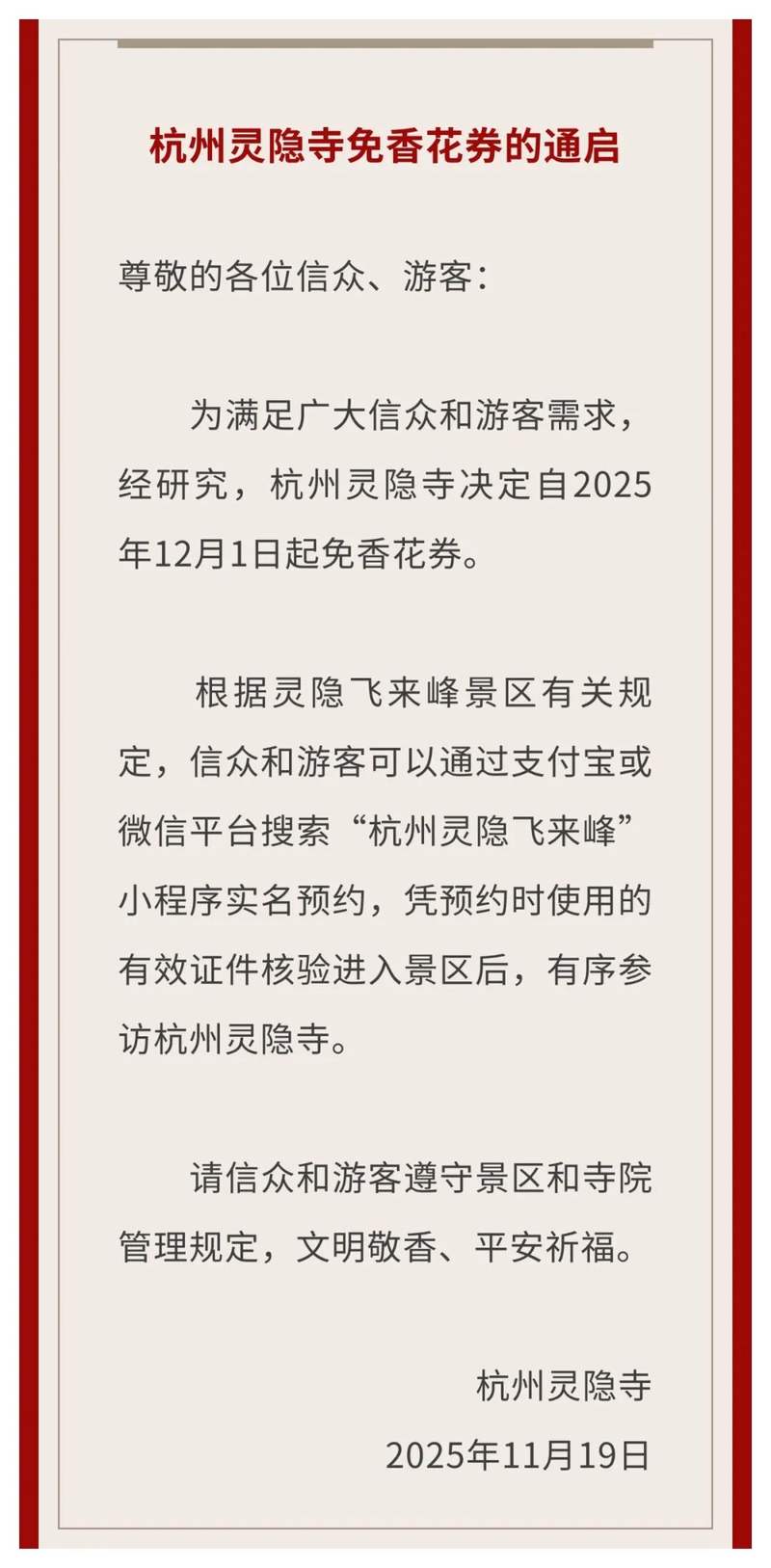 杭州西湖风景名胜区11月19日发布通告称,自2025年12月1日起,灵隐飞来峰景区(含灵隐寺、永福寺、韬光寺)将免票开放,游客可通过线上预约方式进入景区。与此同时,灵隐寺发布《杭州灵隐寺免香花券的通启》。这意味着游客无需再支付灵隐飞来峰景区45元门票和灵隐寺30元香花券,合计75元的费用将全部取消。