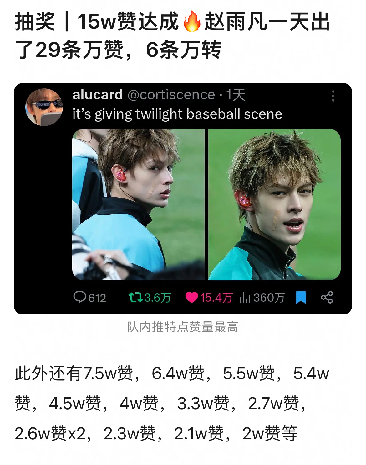 Cortis赵雨凡够🐮 目前队内黑X最高👍🏻的推出现了,15.4万而且一天时间出了29条万赞,6条万转