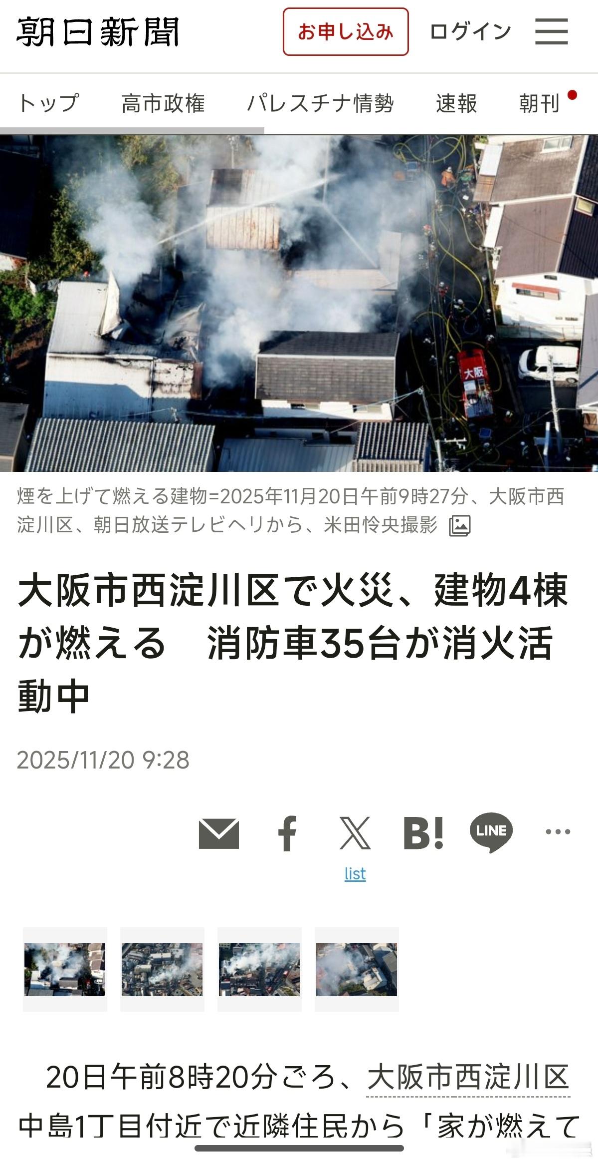 【大阪市西淀川区发生火灾,四栋建筑物被烧毁;35辆消防车正在灭火】昨天(19日)是大分市,今天是大阪市,日本的火灾接二连三!