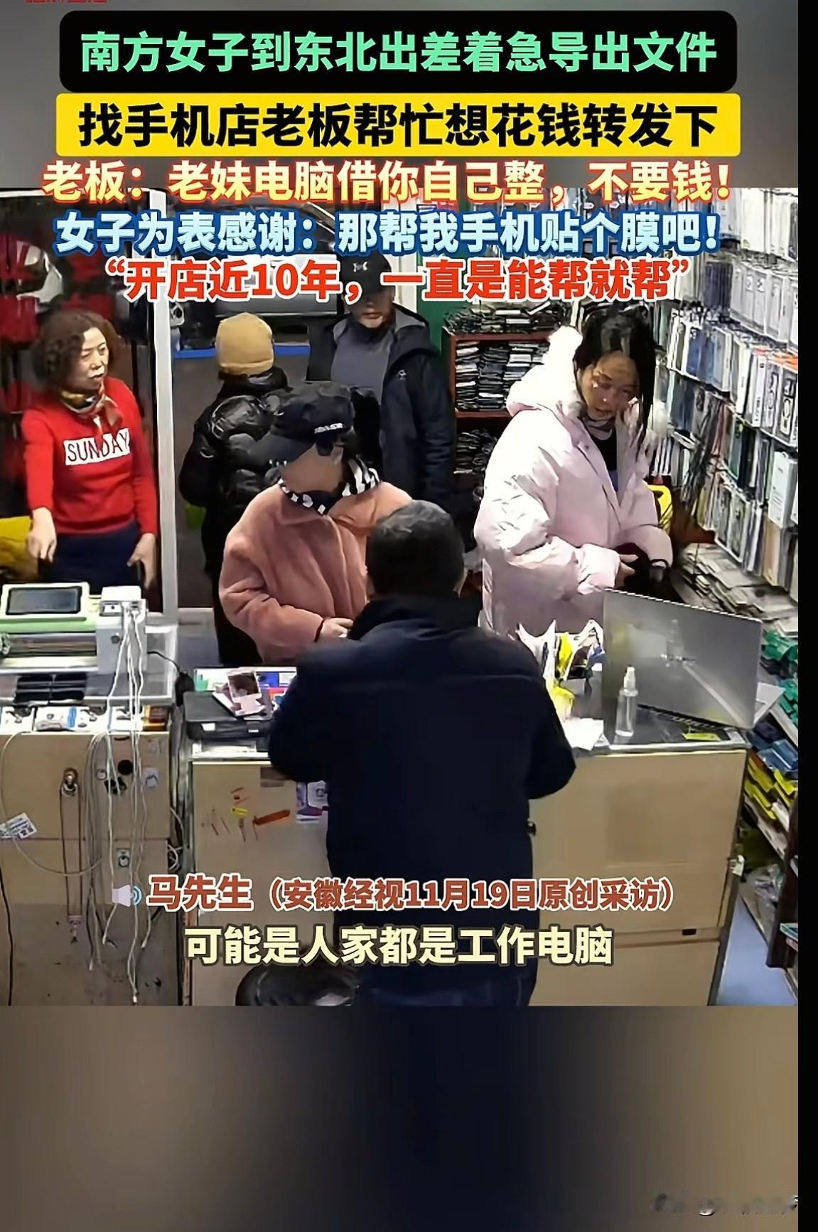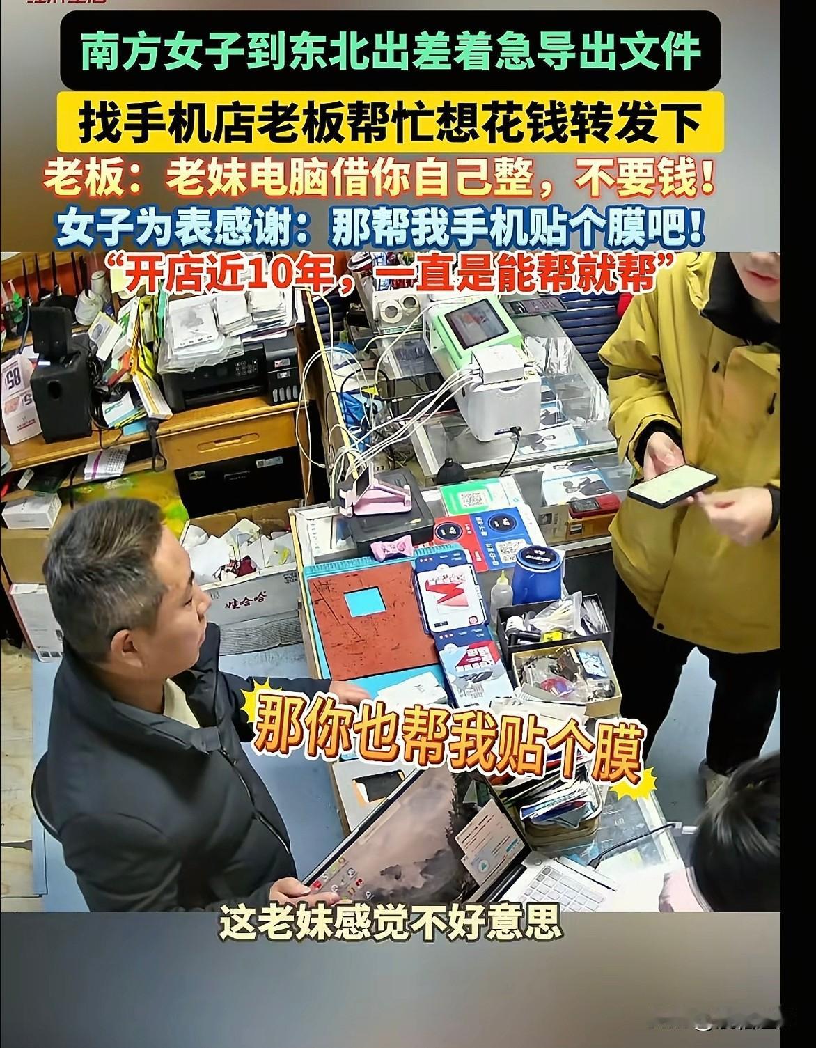 知恩图报!一女子到哈尔滨出差,因着急导出文件,来到一家手机店,提出花钱用下电脑。忙碌的店主二话不说把电脑借给了她。文件导出后,女子本打算给钱,结果店家忽然来了一句:“借给你的就不需要钱。”女子满脸不可思议,接下来的一个操作,让店家心头一暖。 女子也没想到,自己一个素不相识的外来顾客,借用了电脑,老板居然分文不取,但骨子里的善良告诉她,这份“人情”她不能白用,更不能欠,得好好还回去! 根据第 一时间11月16日报道,这件双向奔赴又暖心的事,就发生在一家小小的手机店里。 店主透露,女子当时进屋时,他正忙着招呼别的顾客,听到女子刚下飞机,急需用电脑导文件,他猜测对方肯定是在外面实在找不到地方了才进来的,本着能帮则帮的态度,他压根没打算要钱,听到女子说要付费,只觉得不过是举手之劳,就直接拒绝了。 而让店主没料到的是,女子反应能力特别快,连声道谢后,突然话题一转:“那你也帮我贴个膜吧!” 店主当场愣了一下,随即会心一笑,他没想到这女子是变着法子还人情,特意照顾自己的生意,马上接过手机细心的贴上了一张膜,随后女子又连声道谢,给钱后才离开。 男子觉得,做了好事马上得到了回报,心里特别暖,就把视频发到了网上,他还解释说:开店10年了,这不是第一次做好事,平时遇到老弱病残,能帮则帮,希望大家在别人遇到困难时,在能力范围内搭把手。 有网友说:这种别看店面小,就凭老板这份善良,生意都不会差! 也有人说:女生也太会办事了,要是我可能被拒绝了也拉扯一番,傻傻的僵持,但是她说却说贴个膜吧!让人无法拒绝,既还了人情,又不让人尴尬,真是学到了! 真是应了那句话:“但行好事莫问前程。” 这件事真是让人越品越暖!老板是真善良,忙着做生意还愿意对陌生人伸出援手,而女生更会来事,不白占别人便宜,简直是高情 商的典范! 真希望这样的好人好事能够多一点!人与人之间多一份体谅,多一份真诚,生活才会更加美好。