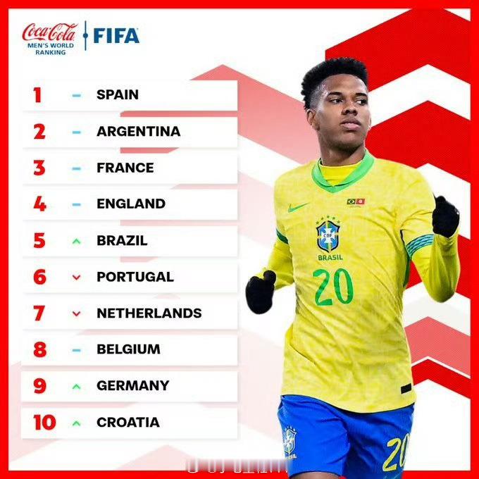国际足联公布最新一期世界排名,中国队排名仍居世界第93,亚洲第14。国足过去4个月里未参加国际比赛,积分仍是1249.06,相较上期排名无变化。西班牙居榜首,巴西升至第五,意大利跌出前十。