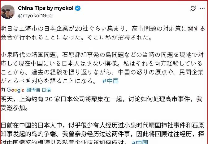 刚爆大瓜!日本博主推特爆料,上海20家日企要扎堆开会,核心就是应对高市风波的连锁冲击,比起看热闹的路人,在华做生意的日企和中文平台日本创作者早慌了神。 在华日企早把命脉绑在国内供应链上,上海不少日企深耕汽车零部件、精密设备领域二十年,供应链环环相扣,一点舆情波动就会让采购、出货乱了节奏,加上日本本土市场增长乏力,对华依赖度只增不减,稳定运营根本输不起。如今管理层多没经历过早年高压舆情,没现成预案,扎堆取经过往舆情应对经验,无非是想细化流程、稳住客户,避免风险扩散。 另一边日本创作者更两难,本土娱乐市场收缩,中文平台成了主要阵地,靠生活、美食内容接商单谋生,舆情一变播放量、合作就受牵连,还被本土舆论施压回流,只能靠细化内容合规、把控评论区减少波动。 本质上不管是企业排产发货,还是创作者更文接单,都靠稳定预期撑着,高层的不当言论买单的却是深耕本地的从业者。真正该看清的是,互利共赢才是合作根基,单边挑衅只会搅乱双方节奏,砸了共同的饭碗。