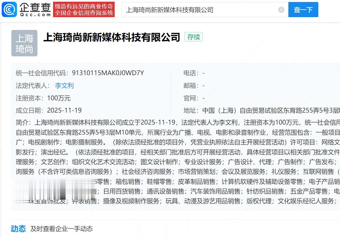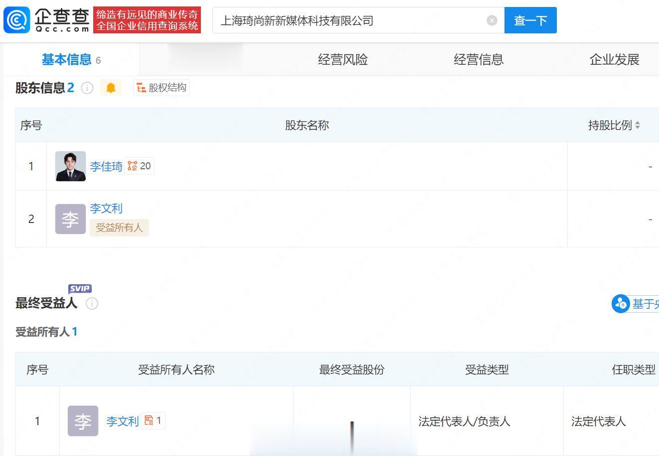 [#李佳琦投资成立新公司#]#李佳琦成立新媒体科技公司#企查查APP显示,近日,上海琦尚新新媒体科技有限公司成立,法定代表人为李佳琦母亲李文利,注册资本100万元,经营范围包含互联网信息服务、电视剧制作、电影发行等,企查查股权穿透显示,该公司由李佳琦和李文利共同持股。