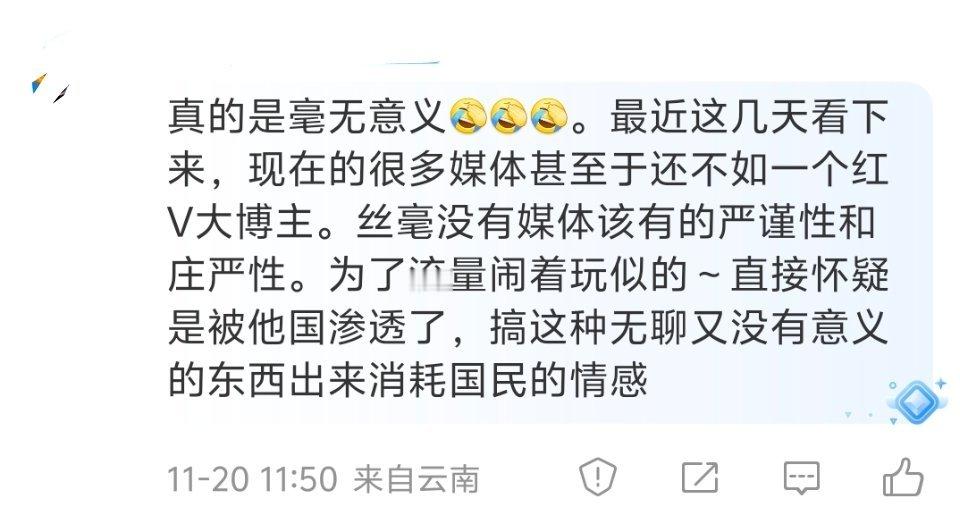 媒体不行已经很久了,是饭圈给他们赋魅太多。新媒体商业化之后,就变得乌烟瘴气。天天活着像个打广告的。什么蓝V,什么六公主,这种称呼就是媚权的体现。