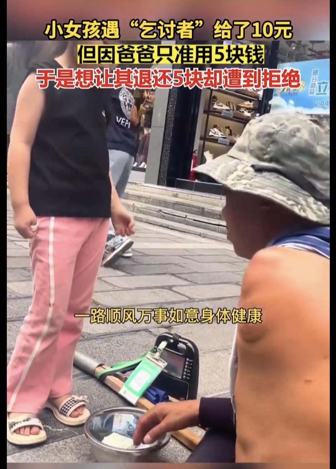 小女孩10块零花钱“被骗了”, 乞讨者认钱不认人, 善意的举动换不回“乞讨者”的一丝良知。 一开始演绎的是小女孩用爸爸给的零花钱献爱心,但这份10块钱的爱心只能给一半,另一半还要回家交差! 小女孩向乞讨者说明情况:“我爸爸只能让我用5块”,还是又重复了一遍,却换来的只是几句冰冷的感谢与祝福。 “乞讨者”得到了多余的善款,而小女孩心灵受到了重创。 这说明什么,多余的爱永远不会多余,因为在他们眼里只认钱。 永远不会真心的感谢与祝福。 你又是怎么看待这件小小的善举么?