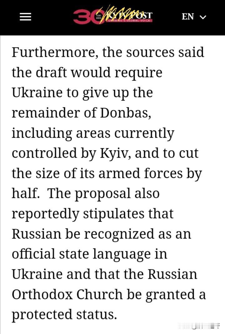美俄又制定了一个结束战争的新和平方案,方案内容为:1:乌克兰放弃整个乌东地区;2:削减一半武装力量;3:放弃先进武器;4:放弃寻求美国的军事援助;5:乌克兰必须承认俄语为乌克兰官方语言地位;6:俄罗斯东正教获得乌克兰的官方地位;7:美国与乌克兰共享乌克兰的先进无人机技术。 🤔 怎么样,够绝吧,尤其是最后一条。川普和普京是两条恶棍。