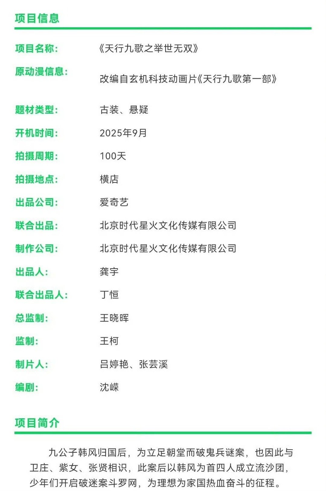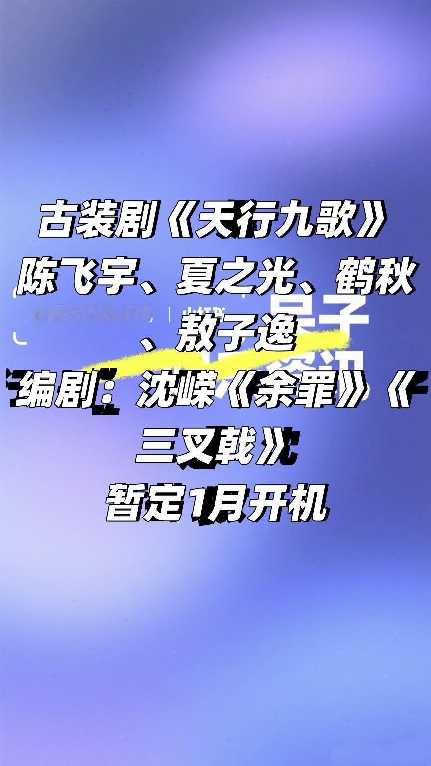 古装剧《天行九歌》暂定一月开机出品:爱奇艺、稻草熊出品人:龚宇编剧:沈嵘《余罪》《三叉戟》