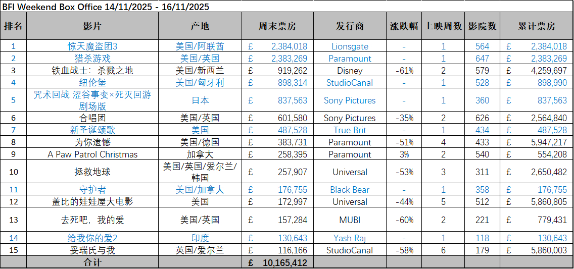 英国周末票房(11.14-11.16):1.《惊天魔盗团3》以微弱优势夺冠,与《猎杀游戏》票房不相上下;2.《咒术回战 涩谷事变×死灭回游 剧场版》开画成绩不错。(数据:BFI)