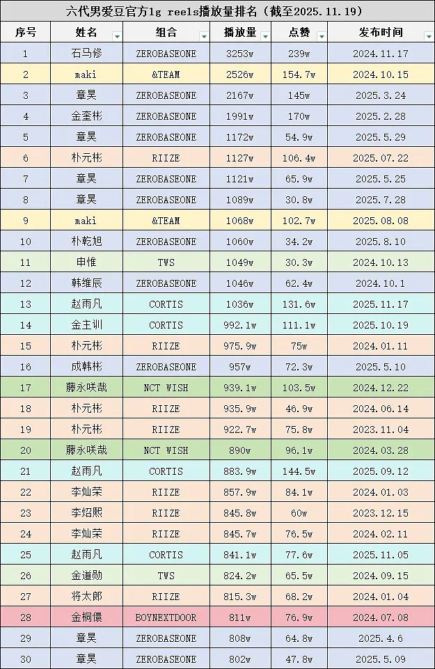 为什么六代男爱豆ig播放量排名章昊前10/4而朴元彬前10/1我以为他是真韩
