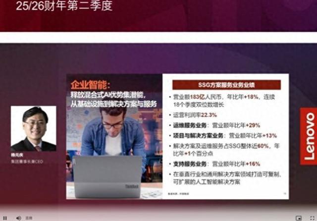 其余业务方面,报告期内联想集团ISG(基础设施方案业务)实现营收近300亿元,同比增长24%;SSG(方案服务业务)仍是集团三大业务中利润率最高的部分,营收同比增长近20%。杨元庆还在全员邮件中称,项目与解决方案服务业务及运维服务业务合计在SSG整体营收中的占比提升到了近60%。