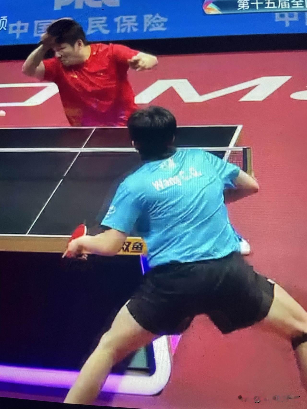 全运会乒乓球男团决赛 北京队对阵上的队 第二场男单 王楚钦对阵樊振东 第一局,开局2:3,王楚钦得分3:3,双方得分5:4,樊振东正手进攻得分5:5,双方得分7:6,王楚钦得分8:6,樊振东接发球反手拧得分8:7,樊振东反手斜线得分8:8,樊振东反手真快。王楚钦防守得分9:8,樊振东球出台10:8,樊振东球下网11:8。王楚钦赢下第一局。 第二局,开局2:6,大头反手球出台2:7,樊振东正手直线得分2:8,王楚钦得分3:8,多拍相持,樊振东得分3:9。樊振东球下网4:9,樊振东反手直线球出台5:9,王楚钦正手斜线得分6:9,王楚钦正手进攻得分7:9,樊振东接发球反手拧中路得分10:7,樊振东局点。樊振东正手进攻得分11:7,樊振东赢下第二局。 第三局,开局1:4,樊振东发球抢攻得分1:5,樊振东反手防守得分1:6,大头发长球抢攻得分2:6,小胖正手进攻斜线得分2:7,多拍相持樊振东得分2:8,樊振东得分2:9,樊振东打的太棒了。樊振东防守反手斜线得分10:2,樊振东局点。大头得分10:3,樊振东反手斜线得分11:3,樊振东赢下第三局。 第四局,开局2:3,精彩多拍相持大头得分3:3,双方打的都好。大头得分4:3,双方得分5:7,精彩对拉樊振东得分5:8,樊振东摆短球出台6:8,樊振东反手得分6:9。樊振东反手太好了。反手变线很快。樊振东正手斜线得分10:6,樊振东赛点。大头得分10:7,大头得分10:8,大头得分10:9。王楚钦正手进攻球出台11:9。樊振东赢下第四局。 樊振东3:1战胜王楚钦 为上海队赢下一分。