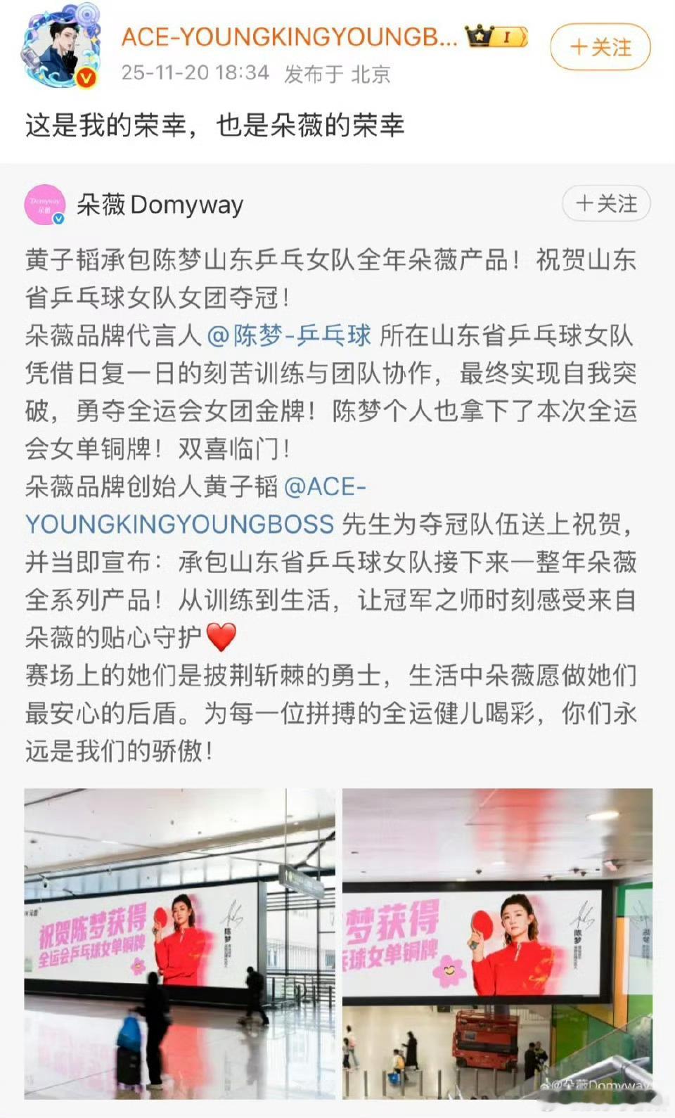 老乡互助太赞了!黄子韬暖心为陈梦及山东队送一年卫生用品,恭喜陈梦夺金,梦幻联动甜度拉满~
