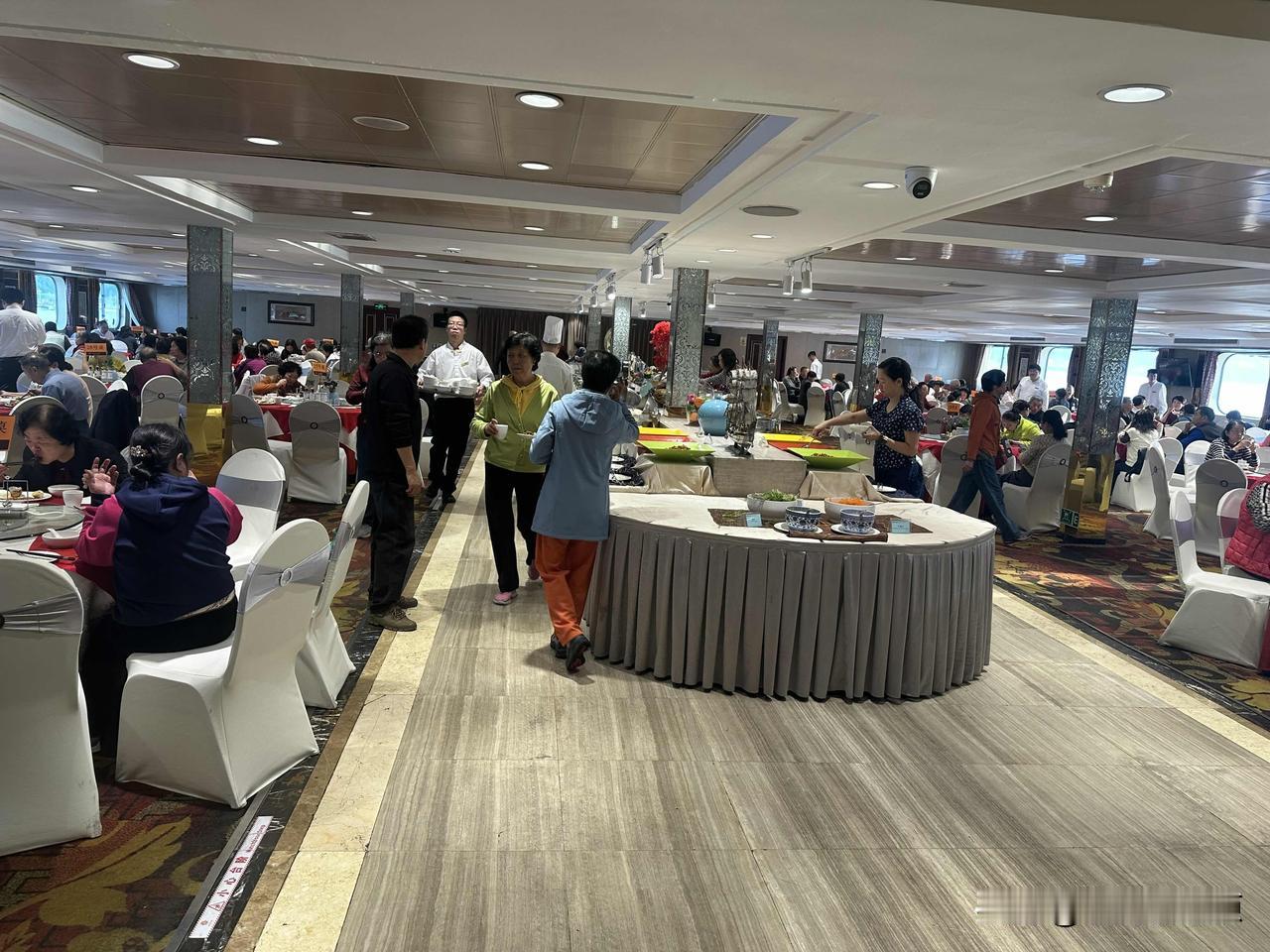 三峡游轮游日记 | 第五天:上午圆梦婚礼,下午丰都鬼城 今天天气晴好,又开始了新的一天,今天活动轻松。吃过早餐,游轮正在通过重庆忠县港,下一个停靠点是丰都港。 上午在船上活动,组织者安排了一个圆梦婚礼,为一些老年游客圆一个婚礼梦,参加圆梦婚礼的有60对老人,最长一对婚龄是50年。参加婚礼的在忙于准备,其他人是看客。我也是看客之一,婚礼开始去看了看,其他时间自由活动,房间上网或在游轮上溜达。 游轮一路上行,中餐是在游轮行进中吃完的,边吃船边行,外面的两岸青山像一幅幅画面闪过,这种体验也是很享受的。中餐后游轮停靠在丰都港,休息一会儿,我们下游轮去游丰都鬼城,这是本次游览长江上的最后一个景点。 丰都鬼城景区位于长江北岸丰都名山,与丰都县城隔江相望,它距今有2000余年历史,是道家“三十六洞天,七十二福地”之一,以“扬善、惩恶、公正、和美”为文化内核,是集道、儒、佛于一体的民俗文化艺术宝库。 下船坐上摆渡车几分钟就到景区门口,景区内峰峦叠翠古木参天,庙宇殿堂神像森罗,拥有奈何桥,鬼门关,天子殿等代表性景点,置身其中,手可触华夏民俗之瑰宝,心能浴仁善礼仪之晶露。经过两个多小时的游览,我们过了奈何桥、闯进鬼门关,黄泉路走一圈,最后出了鬼门关,我们又"重生"了,安全返回了黄金6号游轮。游轮傍晚时分离港向着目的地重庆行进。 这是在游轮上的最后一晚,晚上举行了宾主同乐晚会,也就游客与游轮工作人员共同欢乐,也算是告别晚会,明天就要到重庆朝天门码头,早上吃饭后,退房下船登岸,游览重庆。
