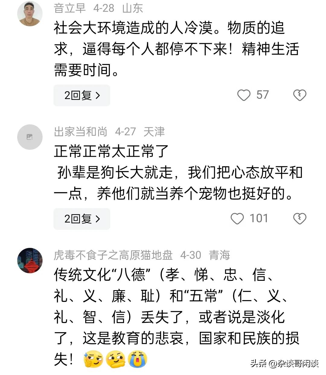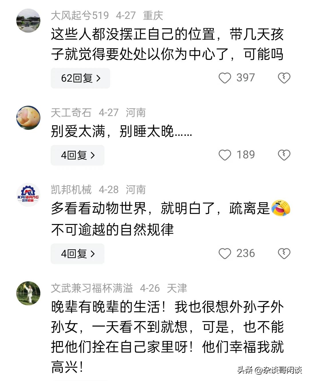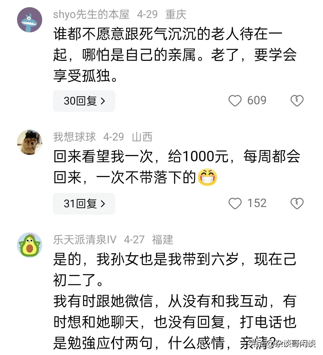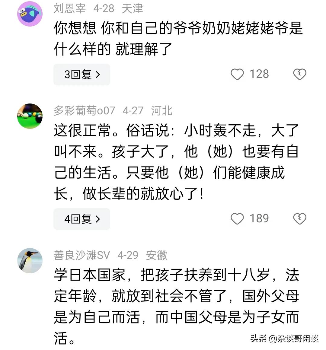 越来越多的老人开始察觉到一个现象,那就是亲手抚养长大的孙辈,不论是孙子还是孙女,亦或是外孙和外孙女,随着他们的成长,似乎与我们之间的联系日渐疏离。 网友观点: 有个人总结了一下:0到三岁 谁带和谁亲! 4到10岁 基本和父母最亲 特别是妈妈!12岁到18岁 和谁都不亲…18岁后 谁给钱 跟谁亲!! 外孙女一出生,便由我们一手带大,在外孙女一岁时,女婿因车祸就离开人世,所以从小到大,从入幼儿园,到上大学,吃喝穿载,都是我们一手管大,生活上从沒亏欠过。现在上大学了,我们去电话询问情况,从来不回话。我们至少每星期去一次电话,可她几个月也不回一次电话。确实叫我们心凉。二十年的养育之恩。等于白白付出。 放平心态,成年以后就是独立个体,养孩子是本能,不能图回报,也没法图回报。 动物世界里,孩子大了就走了,一辈子也不会回来的,正常。 老人对子孙后代的爱和倾其所有的付出是尽全力的。这个就是人类能发展及延续的根本原因吧!千万别有求回报的思想啊!你的子孙的回馈是给他们的后代的,一代一代传承下去。千万别自寻烦恼。 呵呵,不同意可讨论呀。 自己养大的儿女现如今都难交流沟通,更别提孙辈了,我是只帮不带,保持距离,没期盼就没失望,少自找烦恼,过好自己最重要。 我认为原因不是孩子的问题,是整个社会的卷 孩子从上学开始就进入了丛林法则毕业了找工作也是一样的,每天都是疲惫不堪 ,想想他能有什么好心情和状态呢? 当奶奶的把宝贝大孙子一把屎一把尿拉扯大了,儿媳天天的给儿子洗脑,埋怨当爷爷奶奶没有把房子和钱马上都给了大孙子!像这样的大孙子长大了怎么可能对爷爷和奶奶有感恩之心,爷爷奶奶那才是痴心梦想! 如果是动物就不会这样。有一个故事是这样,一个豹子为了抢人车上的一块肉,在后面拼命的追,累的气喘吁吁,得到这块肉以后自己没有吃,却拖回洞里,原来洞里有一个没有能力扑食的母豹。这个故事超过一些人。 时代在变,所以老人要学会接受这种状态,因为传统的家庭气氛被现代高节奏工作替代了,而且下一代人不会象我们这代人上管老、下管少的人,我们这代人时代中人最辛苦、最孝顺、最善良和有爱的人,为我们这代人点赞。 这种现象的出现很正常,原因多方面:一是社会大环境影响,传统文化受到冲击。二是家庭教育及伦理、品德、忠孝文化传承缺失。三是当下年轻人生活节奏快,压力大,工作忙,事情多,确实抽不出更多时间问候。四是存在代沟,共文语言少。作为老人,要调整心态,看淡人生,健康生活,丰富自己的老年生活,颐养天年。 别说孙辈,就是儿女也是一样,这个社会孩子们最不缺的就是接触社会的方式和渠道,跟外面的人相处可比唠唠叨叨的长辈们舒服多了!再不济打打游戏,刷刷视频,聊聊天也比跟家里人面对面交流舒服!当然在外面受委屈了或者需要银两了,肯定是会第一时间找家里人。 我是40岁的父亲,我觉得其实对于孩子没有刻意跟你亲不亲的问题,毕竟他在外边遇到一个陌生年轻人,他俩也能聊到一块去。因为他们有共同的话题。和老人不亲,主要还是一些老年人跟不上孩子的思维,而是想让孩子来跟上你老年人的思维。如果你知道现在年轻人都关注什么,他们对什么感兴趣,你跟他们聊这些话题,而不是天天问他们找到工作了吗?一个月挣多少钱?买房了吗?买车了吗?啥时候结婚?啥时候生孩子? 现在家庭观念太弱了,原因是现在的人生活太累,利益太强,家不是以前的家了,以前的家是港湾,是传承,是避风港,现在的家是走投无路挥向你的最后一把刀,让现在的人重利不重情。 只是因为孩子长大了,有了自己的小世界,不要说祖父母辈,父母辈的都会慢慢退出她们的圈子,所以不要在意,自己年纪越来越大,可能是会越来越感到孤独,但是只有自己爱护好自己,等孩子们再长大一些她们就会懂事能多回来看看你们,所以得多给自己争取些时日,对不? 不要指望付出了会有回报,不仅伤了孩子也伤了自己,只当作在孩子长大的过程中他们一块陪伴自己一天天的变老,是孩子们陪伴你到老,而不是你陪伴孩子长大,这样想心里就平和了。 有何想不通的?别说孙辈了,就是儿女若没事求你,又有多少时间会记挂着父母的?我家女儿就这(女婿就更别提了)。平时外孙女我们带着,负责接送上幼儿园,送上课外班等,到节假日,连个人影都见不到了,发个微信给她,半天都不回。想通了就行了。开开心心地过自己的日子,开心了,身体才会健健康康的。 这是自然规律,孙子孙女小时基本都是爷爷奶奶姥姥姥爷带的,所以会亲,随着孙子孙女一天天长大,他们已经有自己喜欢的事情了,就感到不和自己亲,想开点吧!就是自己的儿女,不也是这样吗?