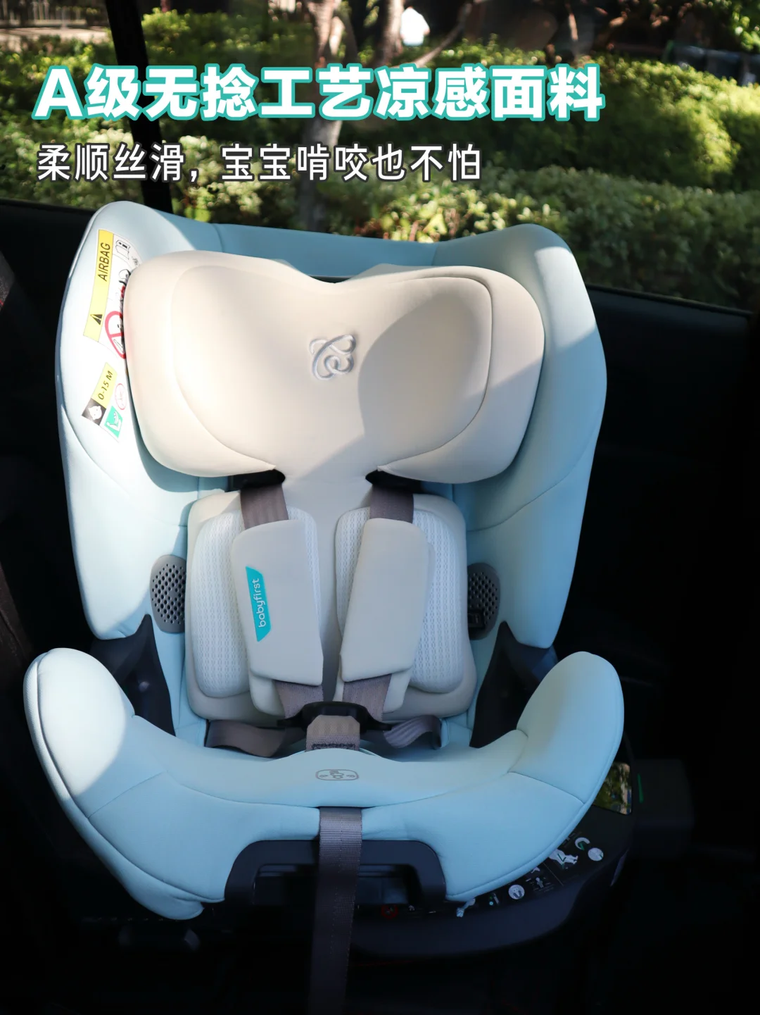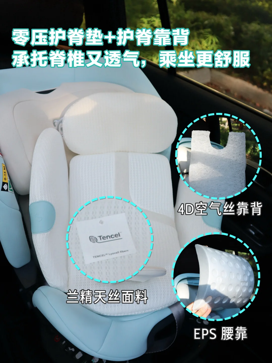 EPS靠腰+4D空气丝填充靠背,承托脊椎又护脊,长途出行久睡也没有受压感;兰精天丝面料,通风透气亲肤,宝宝睡得更安稳!
