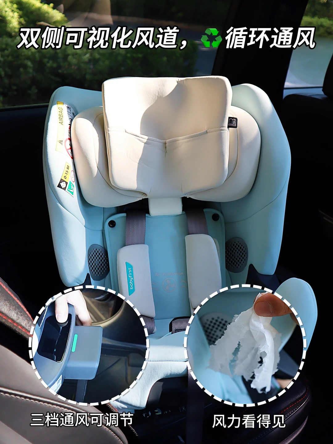 夏天带宝宝出行,车里空调开的再低,坐久了宝宝后背也会出汗。这款安全座椅升级了可视化风道,风力更大,三档风速,后背不再湿漉漉!