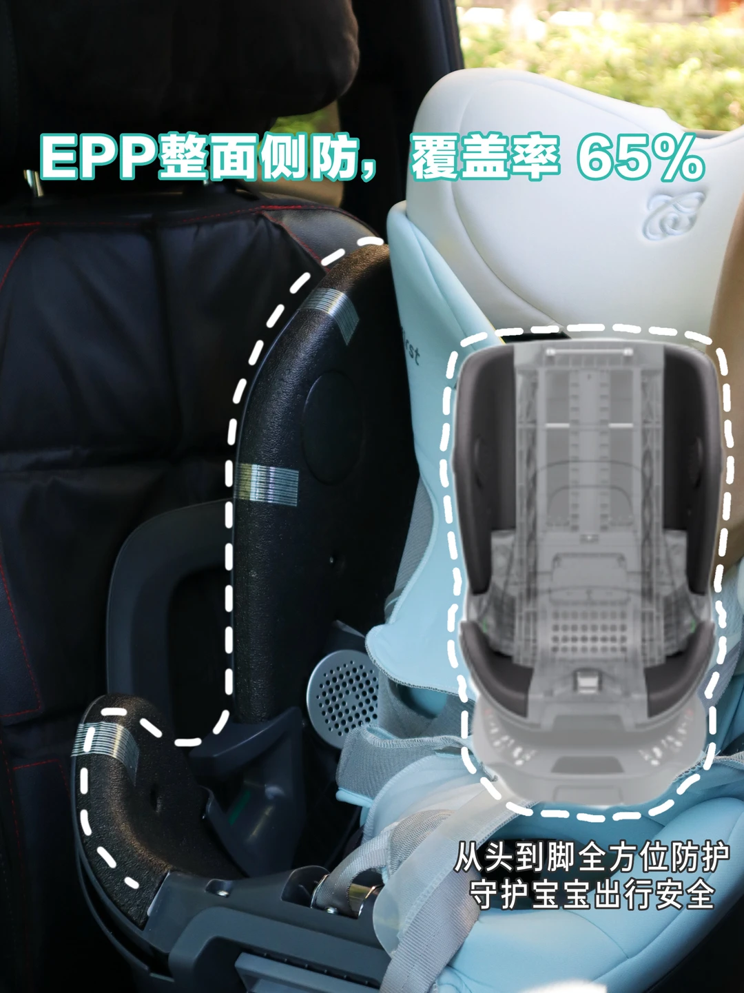 旧国标仅要求正面碰撞测试。数据统计,侧面撞击占事故比例超30%。因此,3C新法规对侧面防护提出严格要求。拿宝贝第一来说,作为参与安全座椅新法规起草的品牌,新上市的灵悦3➕也是行业第1️⃣款新国标安全座椅,整个侧面都采用了EPP吸能材质,来抵御侧撞冲击力。并且,EPP还延续到了座舱底部,整体椅身EPP覆盖面积达65%, 安全倍数进一步提升!