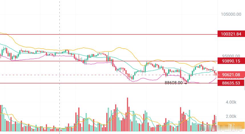11.20晚间大冰非农的消息面一出来,我就猜到今天的剧本了。小时线看,价格已经在第三阶梯来到了第五浪,虽然没有打破这个箱体震荡,但很明显日线双针插低已经在给出筑底信号了。所以今天的日线收线很关键,短期咱们可采取低哆思路。89000附近哆,木标94500,95000,96000,防守500点。