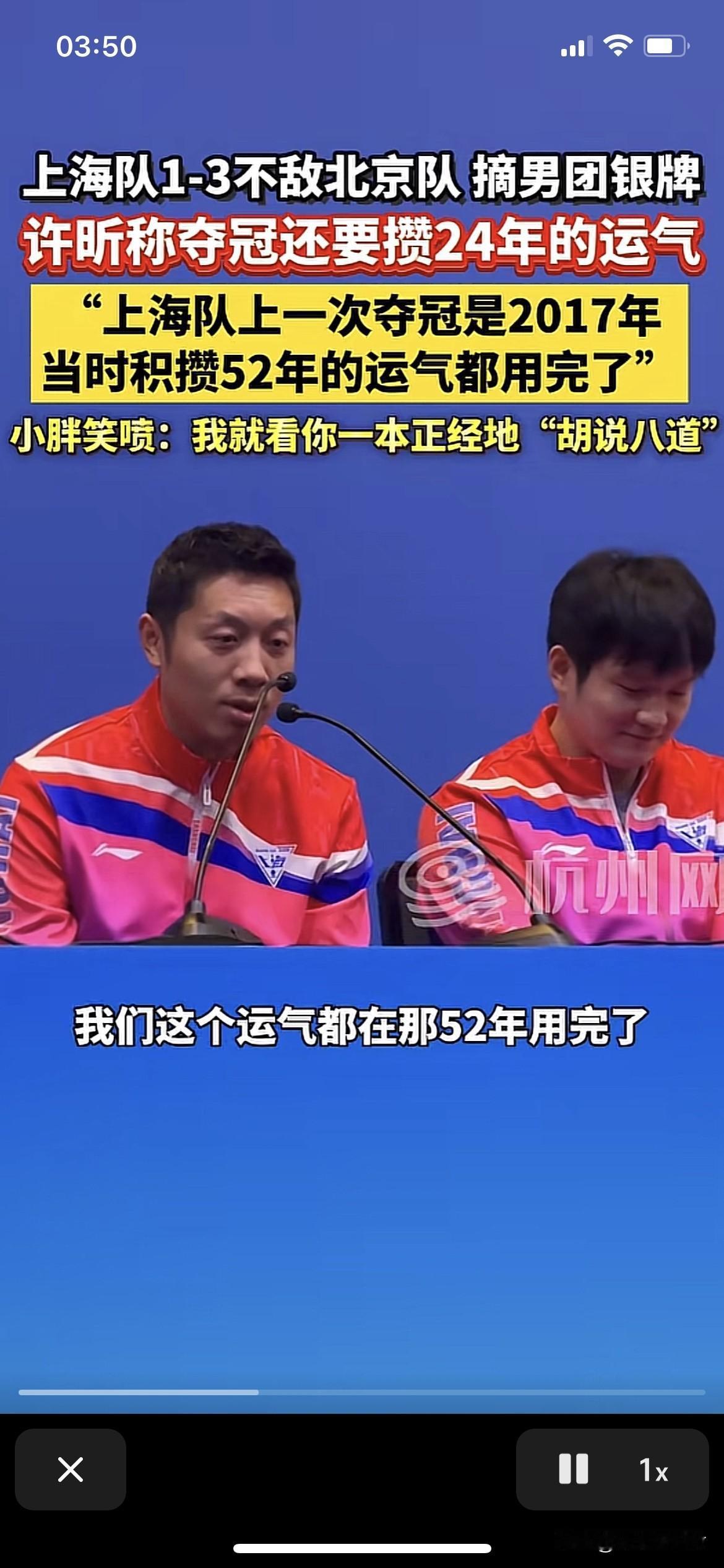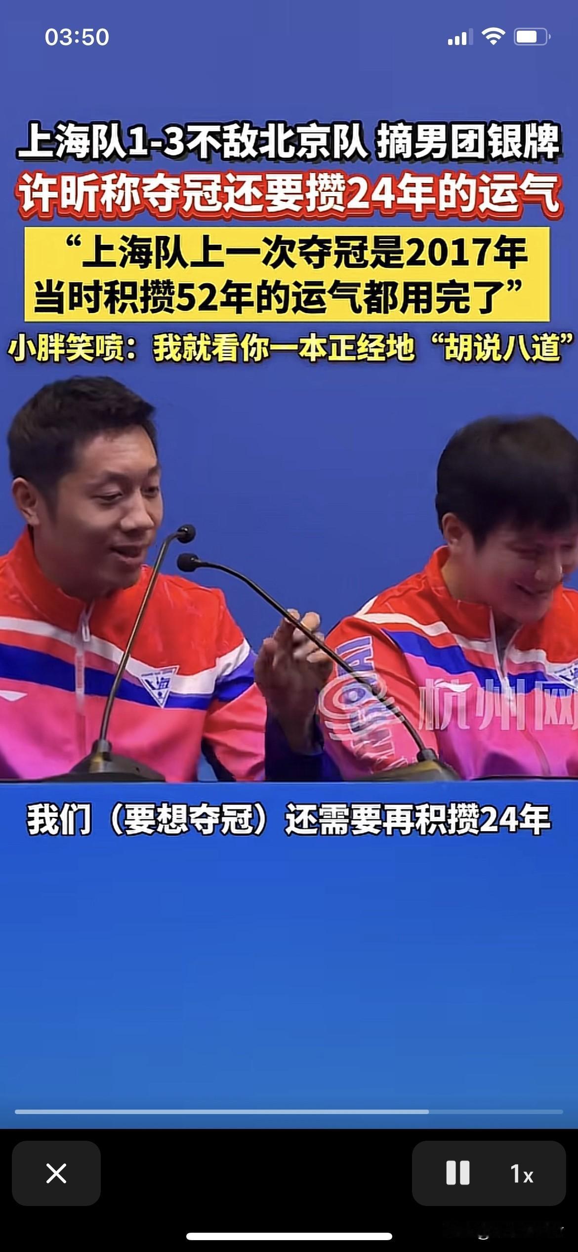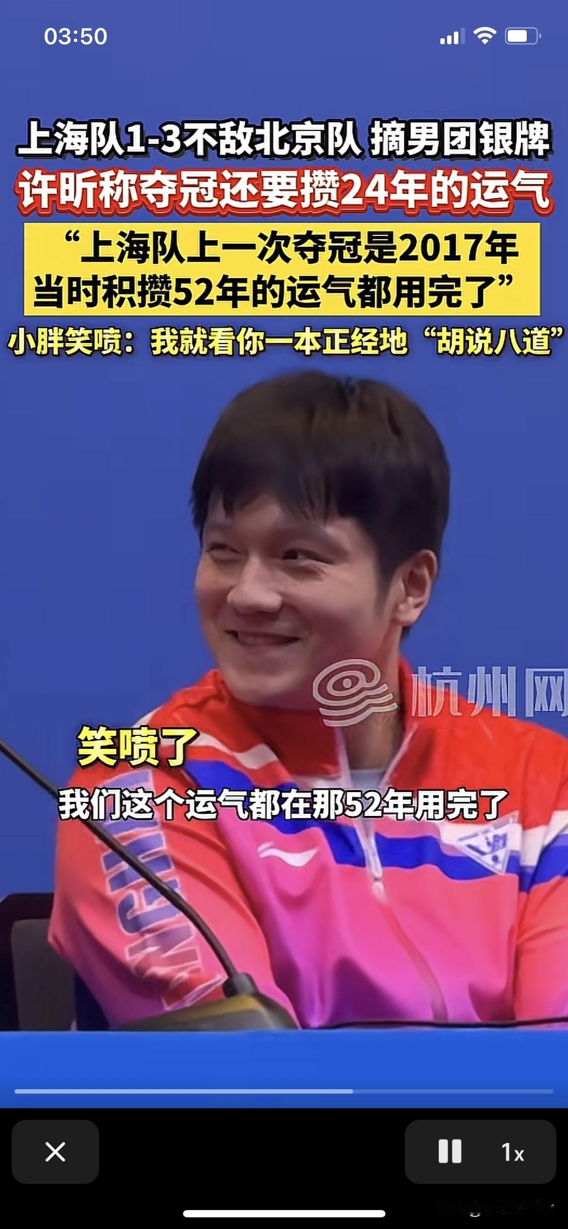 许昕也太会说了!说的樊振东都笑了 上海队1:3不敌北京队获得银牌 许昕赛后发言说:“上海队上一次夺冠是2017年。当时积攒了52年的运气用完了。我们要想夺冠还要再积攒24年的运气。” 樊振东看着许昕笑,许昕自己也笑。 谁知道许昕这24年是怎么来的。 许昕退役后,上海队签林诗栋。四年后就能获得男团冠军🏆[捂脸][捂脸][捂脸]不用等24年。就看上海队怎么做?
