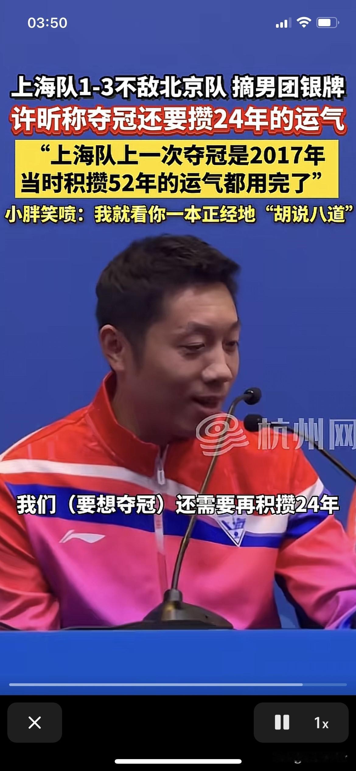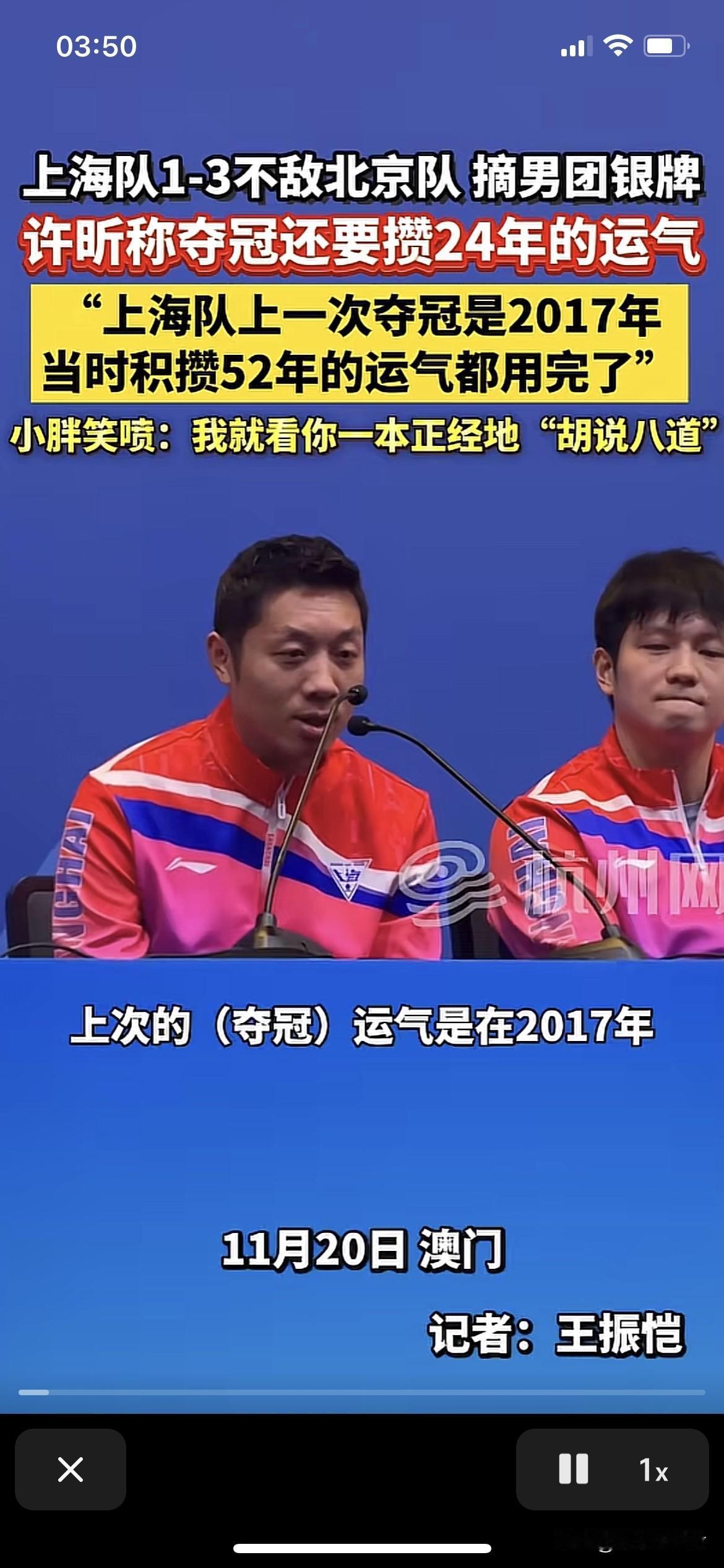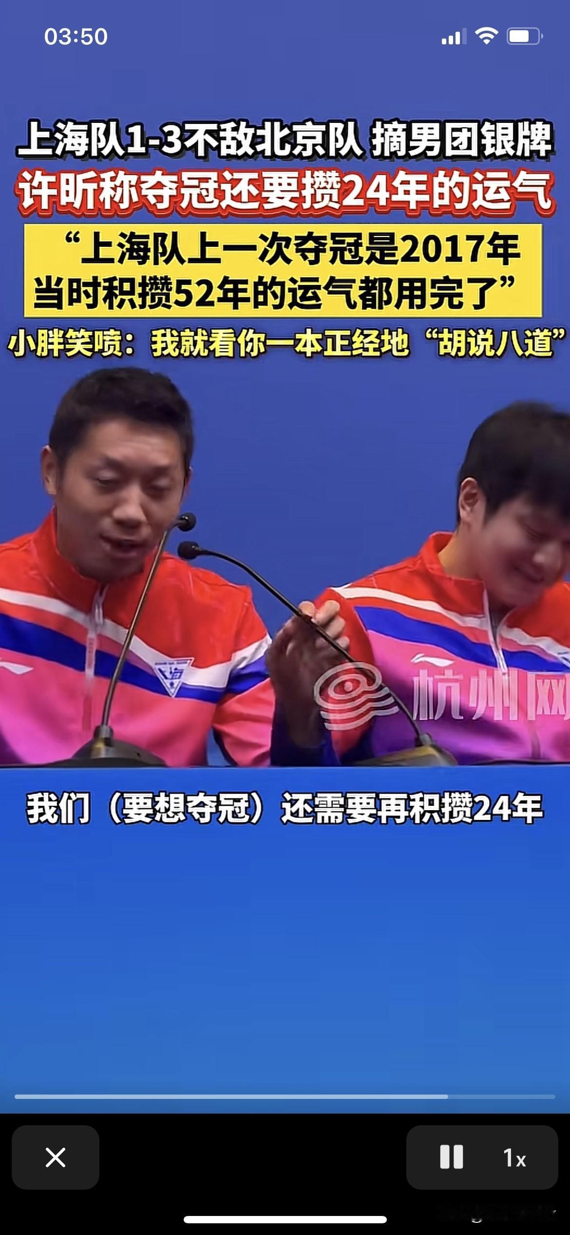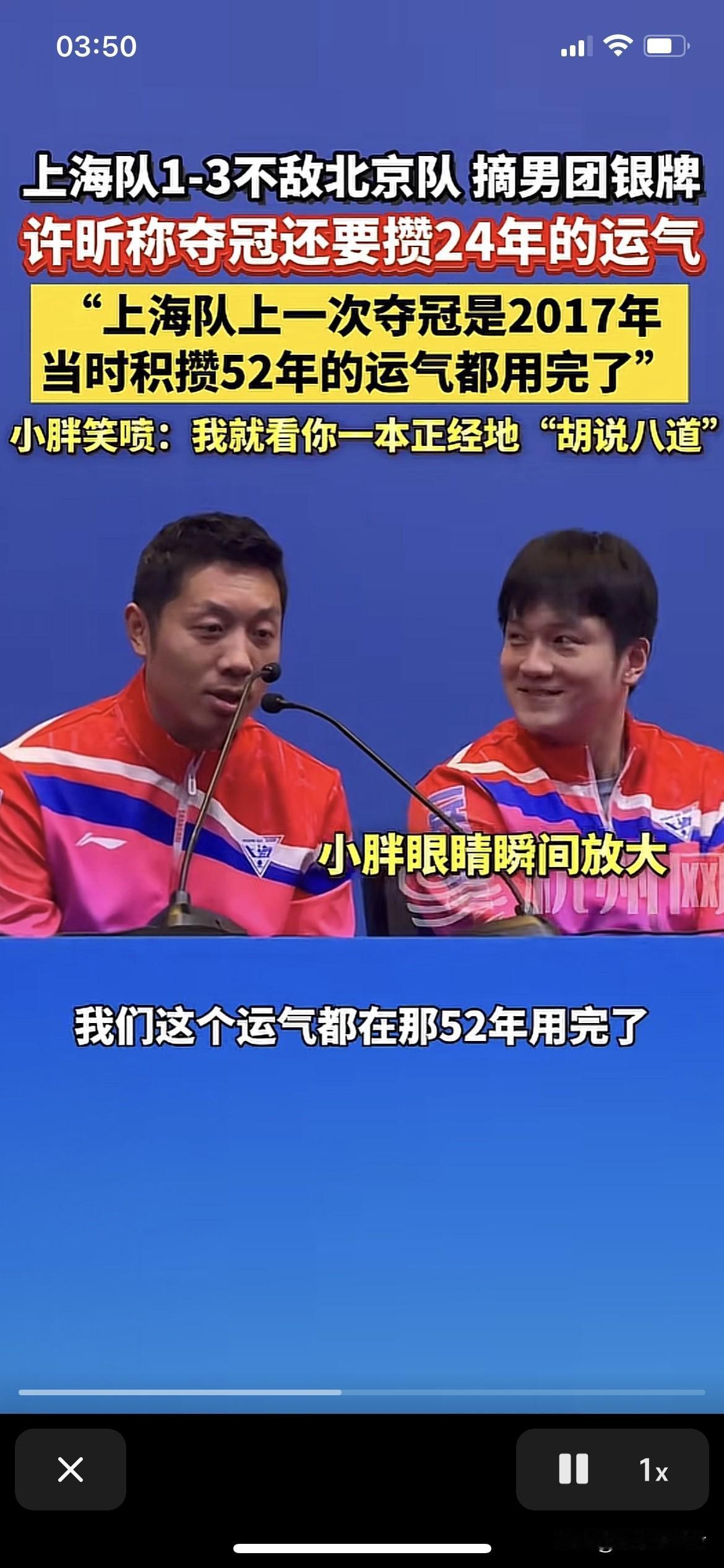 许昕也太会说了!说的樊振东都笑了 上海队1:3不敌北京队获得银牌 许昕赛后发言说:“上海队上一次夺冠是2017年。当时积攒了52年的运气用完了。我们要想夺冠还要再积攒24年的运气。” 樊振东看着许昕笑,许昕自己也笑。 谁知道许昕这24年是怎么来的。 许昕退役后,上海队签林诗栋。四年后就能获得男团冠军🏆[捂脸][捂脸][捂脸]不用等24年。就看上海队怎么做?