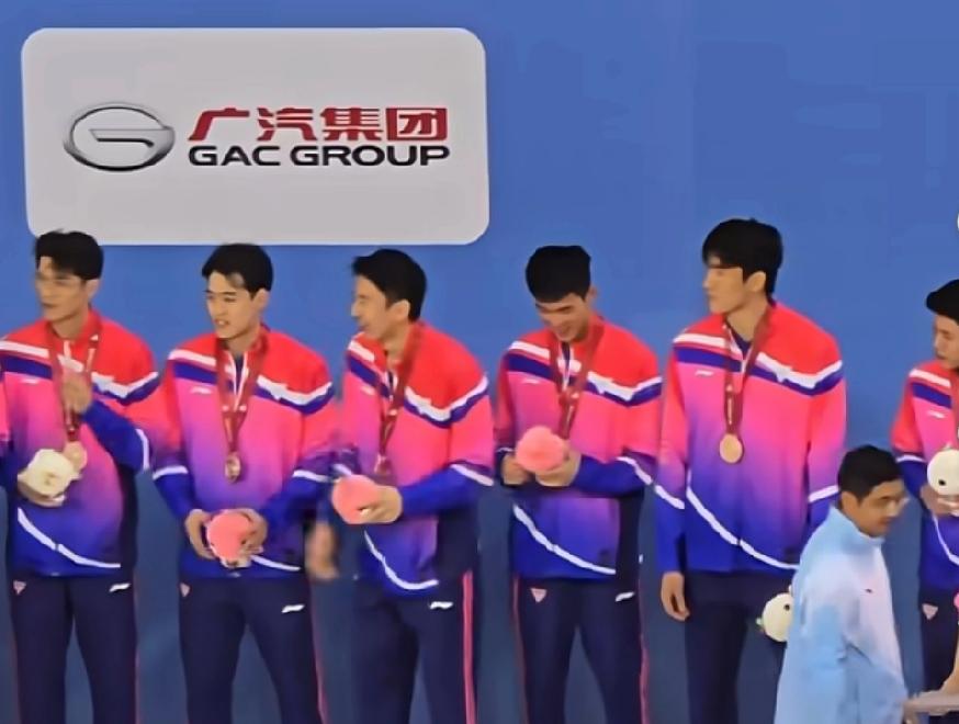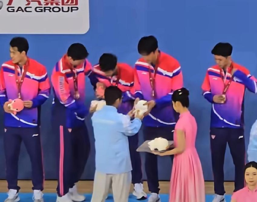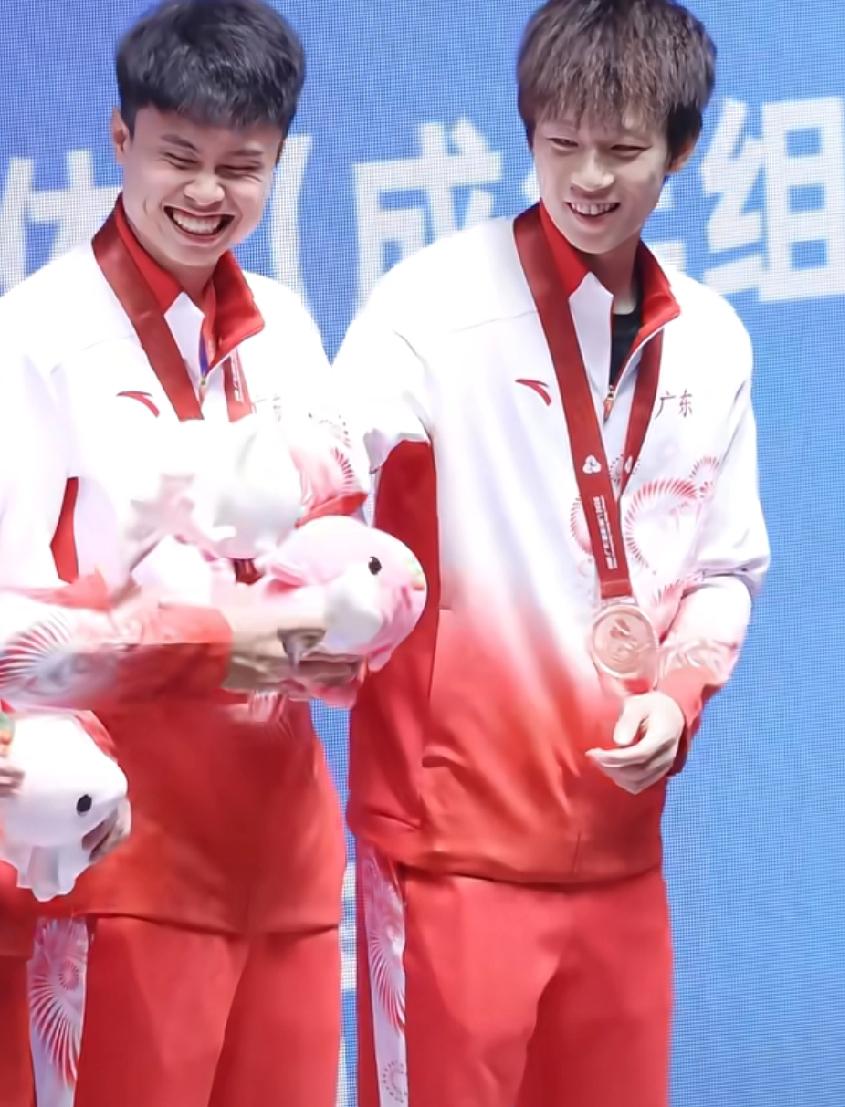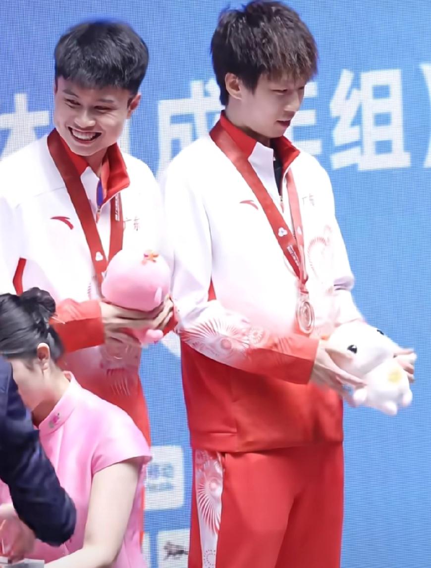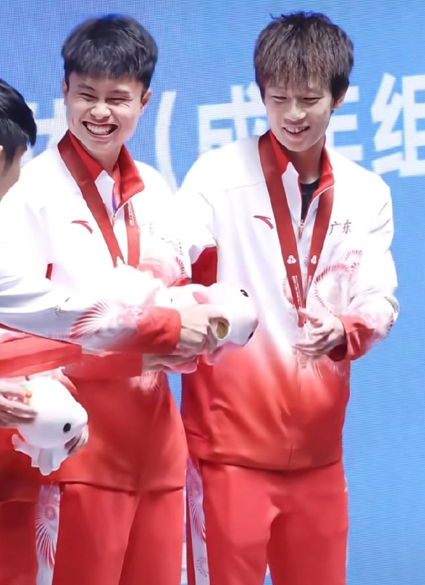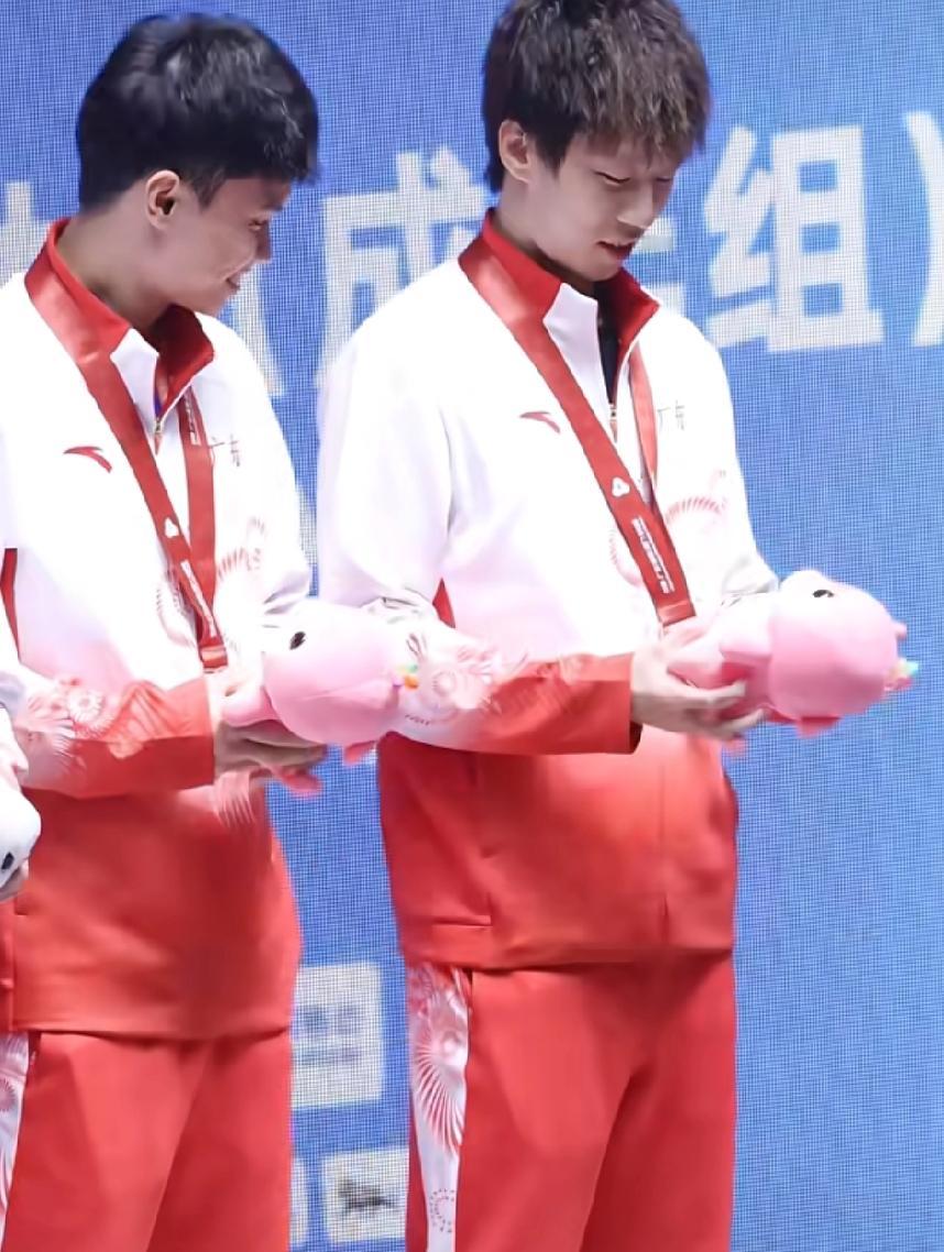 都说这次全运会, 吉祥物大湾鸡很受欢迎, 女仔都抢白切鸡, 男仔都抢豆豉鸡。 昨晚林高远拿到了一个白切鸡, 但是他好像想要那个粉色的, 可是启豪呲个大牙笑着不给他换, 哈哈, 还是旁边的旁边的弟弟跟他换了。 大概高远也想是凑一对吧。 记得还有别的项目的运动员, 直接在台上就硬抢队友粉色的,哈哈。