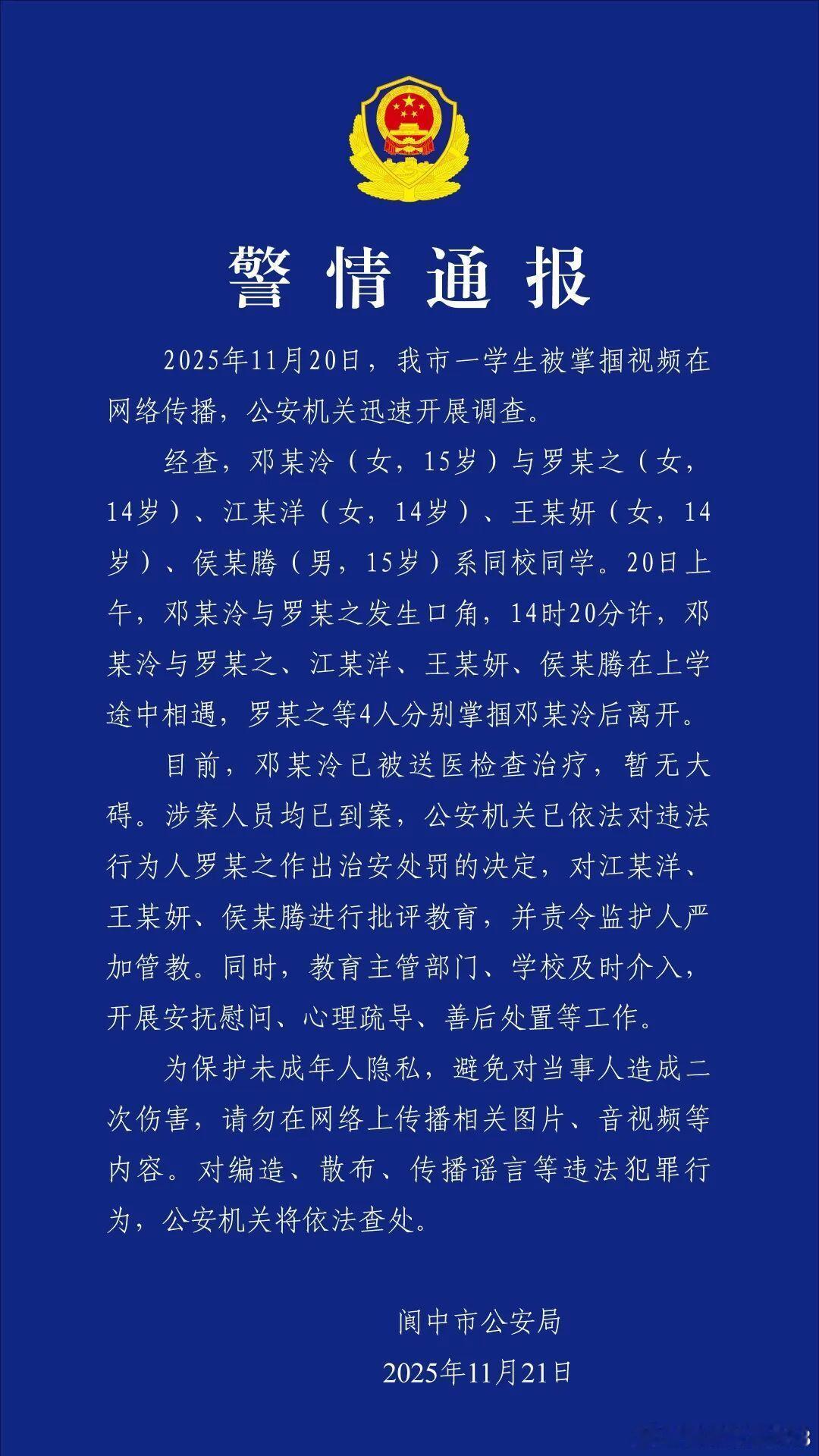 四川阆中15岁女生在上学途中被多人掌掴,警方通报------11月21日,四川阆中市公安局发布警情通报:2025年11月20日,我市一学生被掌掴视频在网络传播,公安机关迅速开展调查。经查,邓某泠(女,15岁)与罗某之(女,14岁)、江某洋(女,14岁)、王某妍(女,14岁)、侯某腾(男,15岁)系同校同学。20日上午,邓某泠与罗某之发生口角,14时20分许,邓某泠与罗某之、江某洋、王某妍、侯某腾在上学途中相遇,罗某之等4人分别掌掴邓某泠后离开。目前,邓某泠已被送医检查治疗,暂无大碍。涉案人员均已到案,公安机关已依法对违法行为人罗某之作出治安处罚的决定,对江某洋、王某妍、侯某腾进行批评教育,并责令监护人严加管教。同时,教育主管部门、学校及时介入,开展安抚慰问、心理疏导、善后处置等工作。为保护未成年人隐私,避免对当事人造成二次伤害,请勿在网络上传播相关图片、音视频等内容。对编造、散布、传播谣言等违法犯罪行为,公安机关将依法查处。