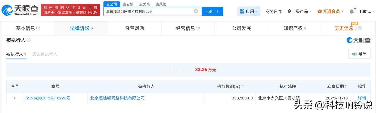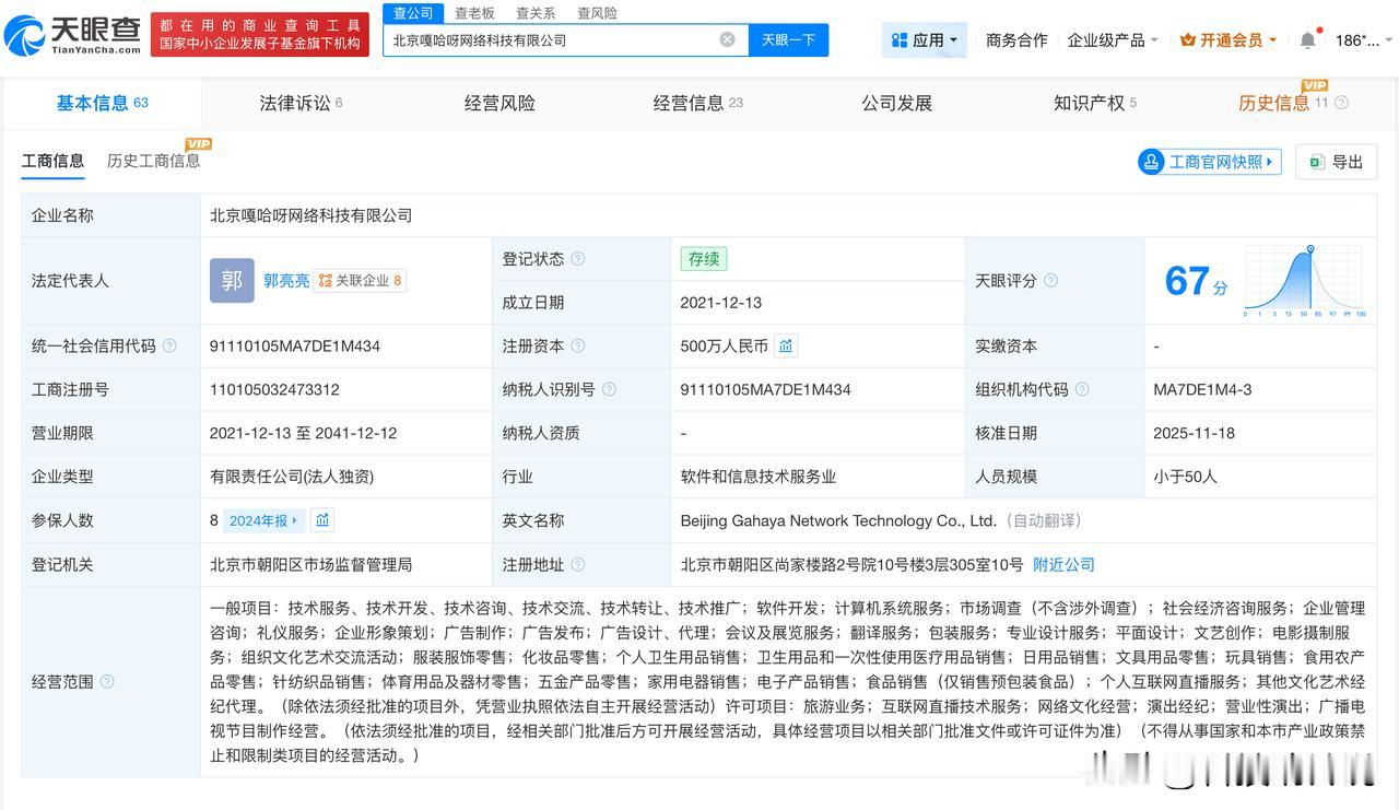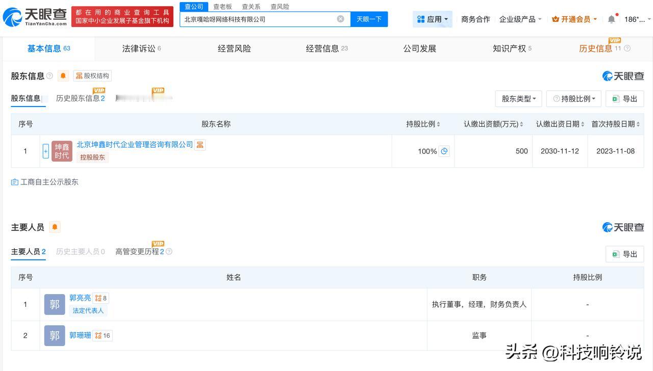 【嘎子哥妻子任职公司成被执行人 嘎子哥妻子任职公司被执行33万】 天眼查App显示,近日,北京嘎哈呀网络科技有限公司新增一则被执行人信息,执行标的33.35万元,执行法院为北京市大兴区人民法院。 北京嘎哈呀网络科技有限公司成立于2021年12月,法定代表人为郭亮亮,由郭珊珊(嘎子哥妻子)担任监事,注册资本500万人民币,经营范围包括社会经济咨询服务、企业管理咨询、礼仪服务等。股东信息显示,该公司由北京坤鑫时代企业管理咨询有限公司全资持股。 天眼查信息: