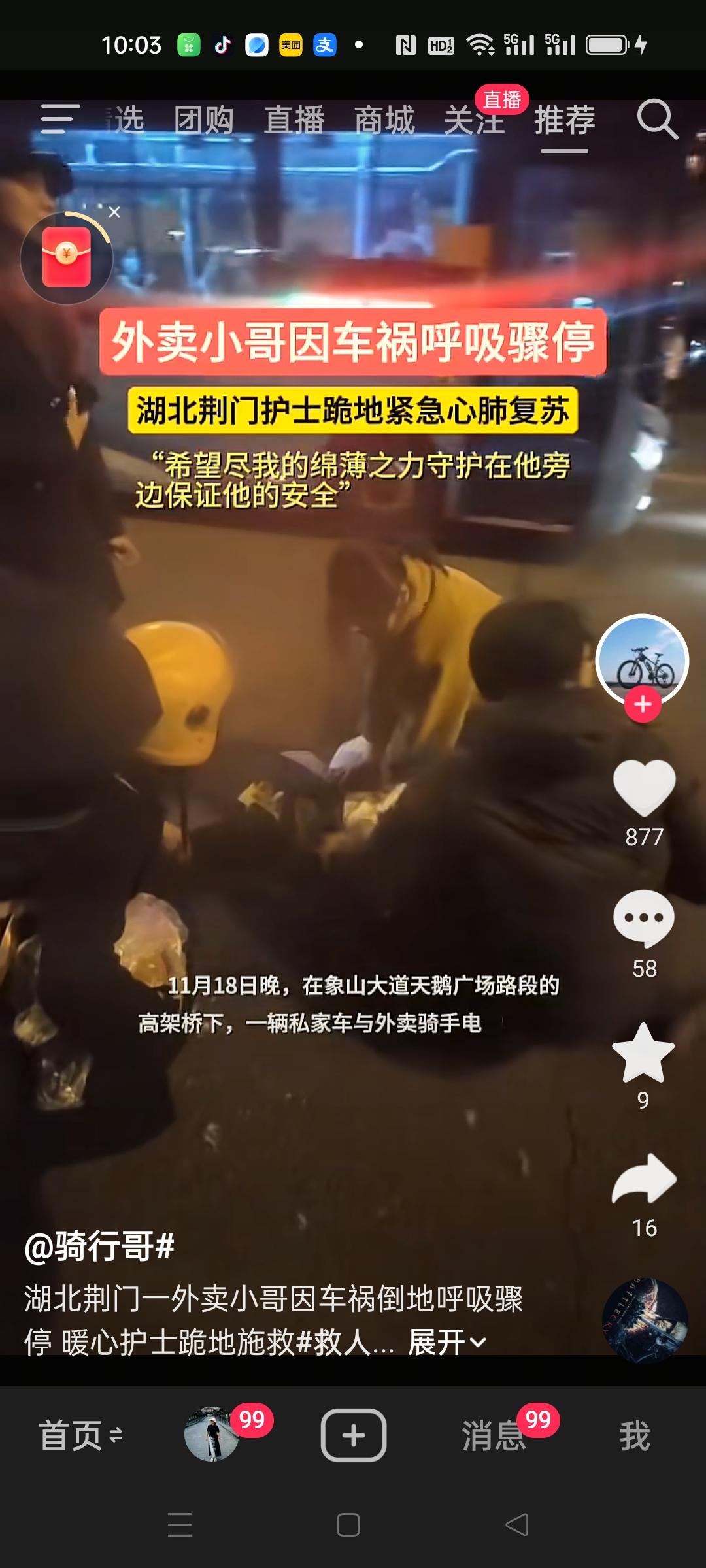 荆门中心医院护士谢小婷路遇车祸,紧急救援伤者。 一私家车与外卖小哥碰撞,小哥倒地呼吸骤停,谢小婷及时进行心肺复苏,一直到救护车到来,将伤者送往医院治疗。 没有呼吸,抢救时间就那么几秒,危急关头,如果不是谢小婷出手相助,一条生命就可能消逝。充分发挥了医护人员救死扶伤的高尚品德,为她点赞!