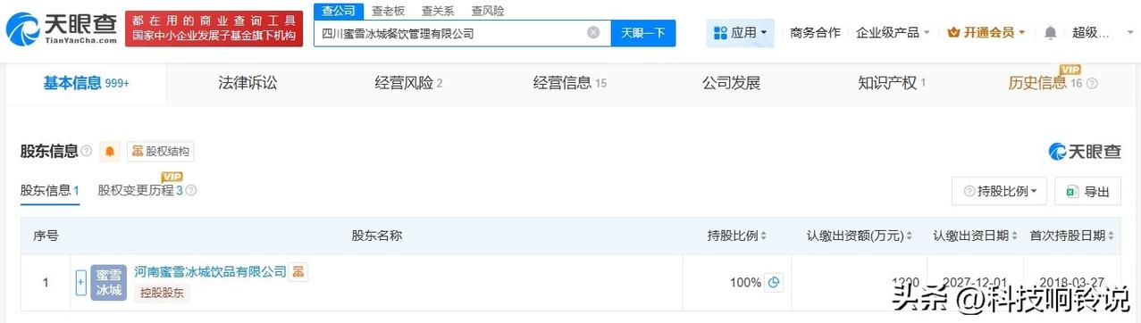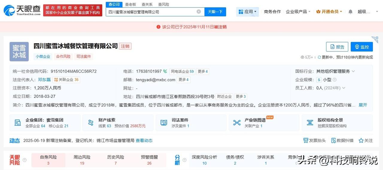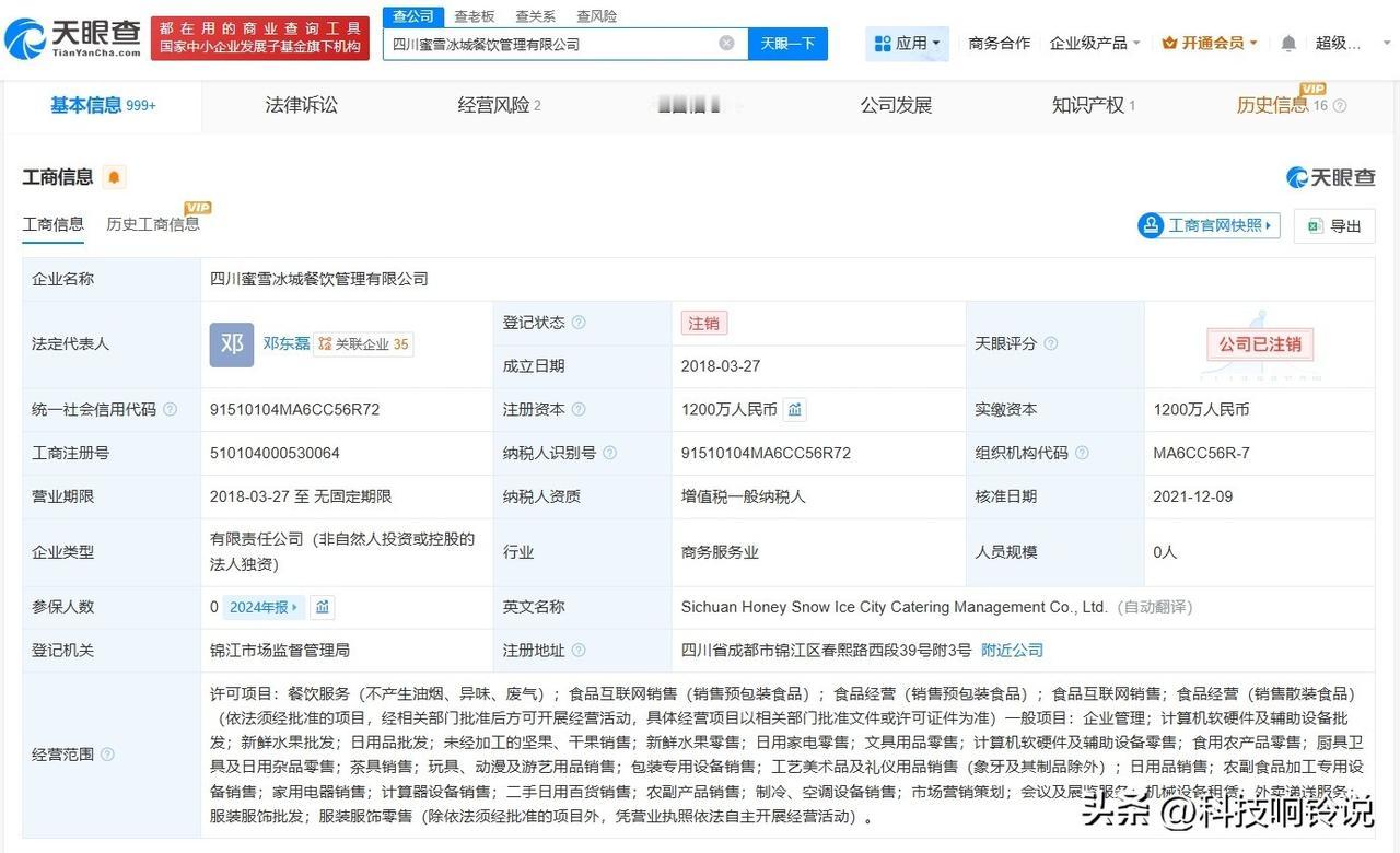 【蜜雪冰城旗下四川餐饮管理公司注销】 天眼查App显示,近日,四川蜜雪冰城餐饮管理有限公司登记状态由存续变更为注销。此前,该公司已进行注销备案。 该公司成立于2018年3月,法定代表人为邓东磊,注册资本1200万人民币,经营范围包括食品互联网销售、餐饮服务、企业管理、二手日用百货销售等。股东信息显示,该公司由河南蜜雪冰城饮品有限公司全资持股。 天眼查信息: