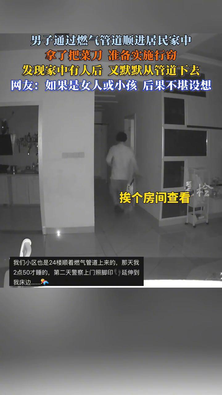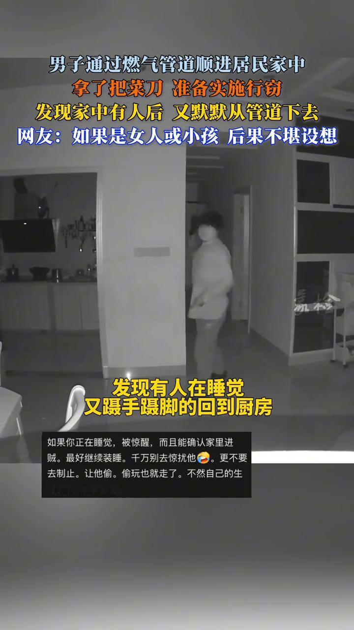 男子通过燃气管道顺进居民家中,拿了把菜刀准备实施行窃,发现家中有人后又默默从管道下去。网友:如果是女人或小孩后果不堪设想。 11月19日,四川宜宾市。男子通过燃气管道爬进居民家中,从厨房中拿了一把菜刀,大摇大摆的走在家里。挨个房间查看,发现有人在睡觉,又蹑手蹑脚的回到厨房。 主人听到动静出来后,一边走到客厅一边拿起手机看监控。说白了,他拿了刀在房间门口观察了一下,大概率是看见身材算魁梧的叔叔觉得自己打不过才溜走了。如果是女性或者瘦弱男性以及小孩子,后果不堪设想。