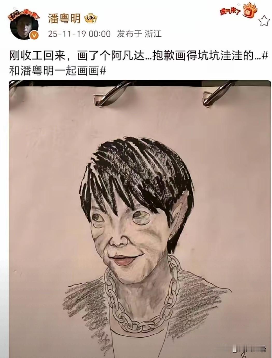 潘粤明收工回去后,随手画了一幅画,还为坑坑洼洼表达了歉意,诚意满满,这画怎么说呢? 感觉除了不像的地方,其它都挺像 至于像谁,一千双眼睛就有一千种认识 我是挺欣赏那个链子的,是买的,还是有人送的? 看着挺结实啊,一分钱能不能买三串? 我的报价是不是有点贱了? 我感觉这个价挺适合某些人的!