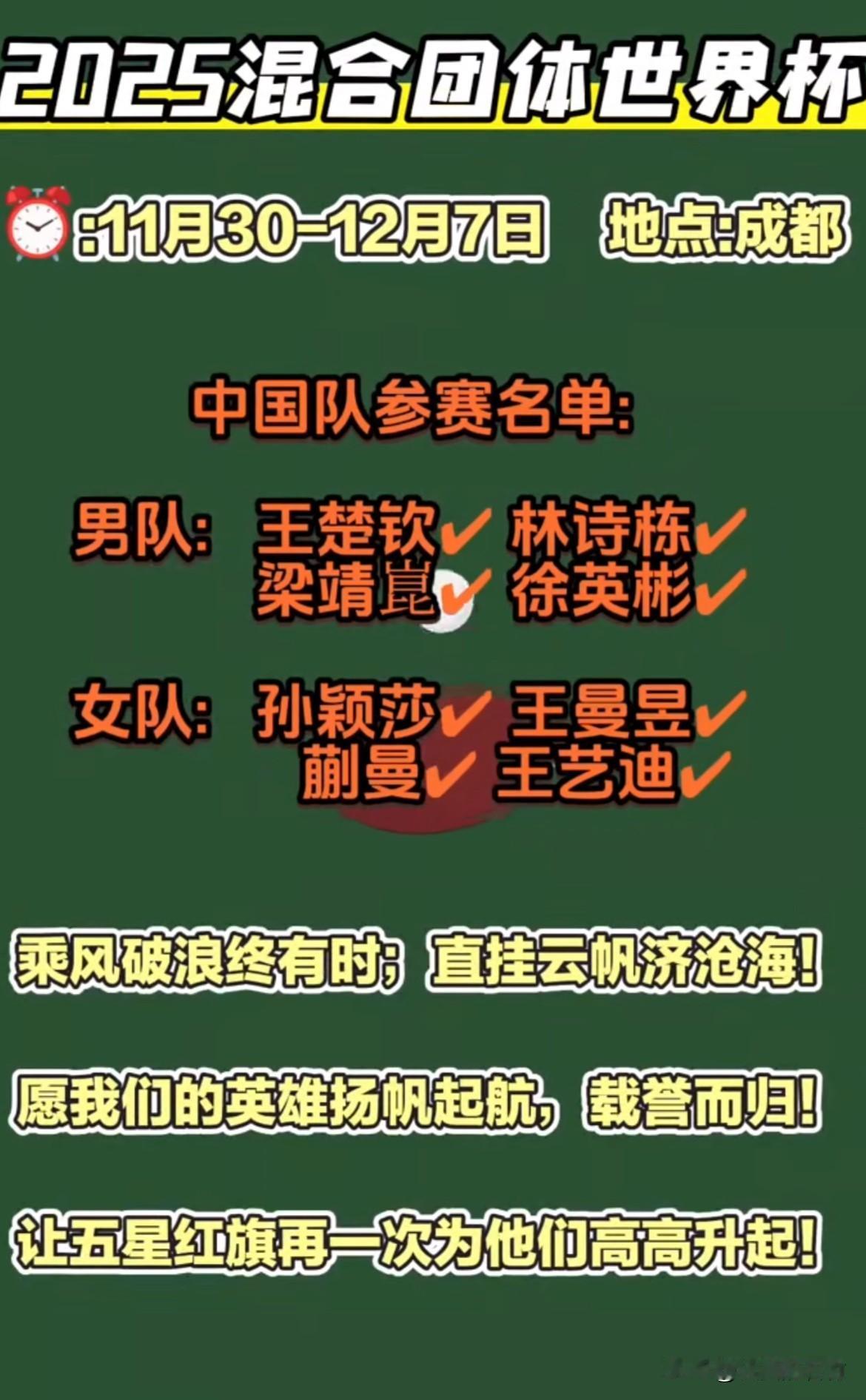 王楚钦林诗栋梁靖崑徐瑛彬全运会结束后,休息几天就要去成都,参加成都混合团体世界杯。 女队有孙颖莎、王曼昱、蒯曼、王艺迪 希望王曼昱和梁靖崑的伤病不会影响成都混合团体世界杯的比赛。 这些人里王楚钦一直到11月20日晚上还有男团决赛。很辛苦。 混合团体世界杯。15局8分制。第一场混双,第二场男单,第三场女单,第四场由分低的方决定男双还是女双,第五场打剩下的男双或女双。每场3分,哪队先拿8分哪队赢。第一届的时候混双不能打男女单,不知道今年会不会改制。 五场是 混双 男单 女单 男双 女双