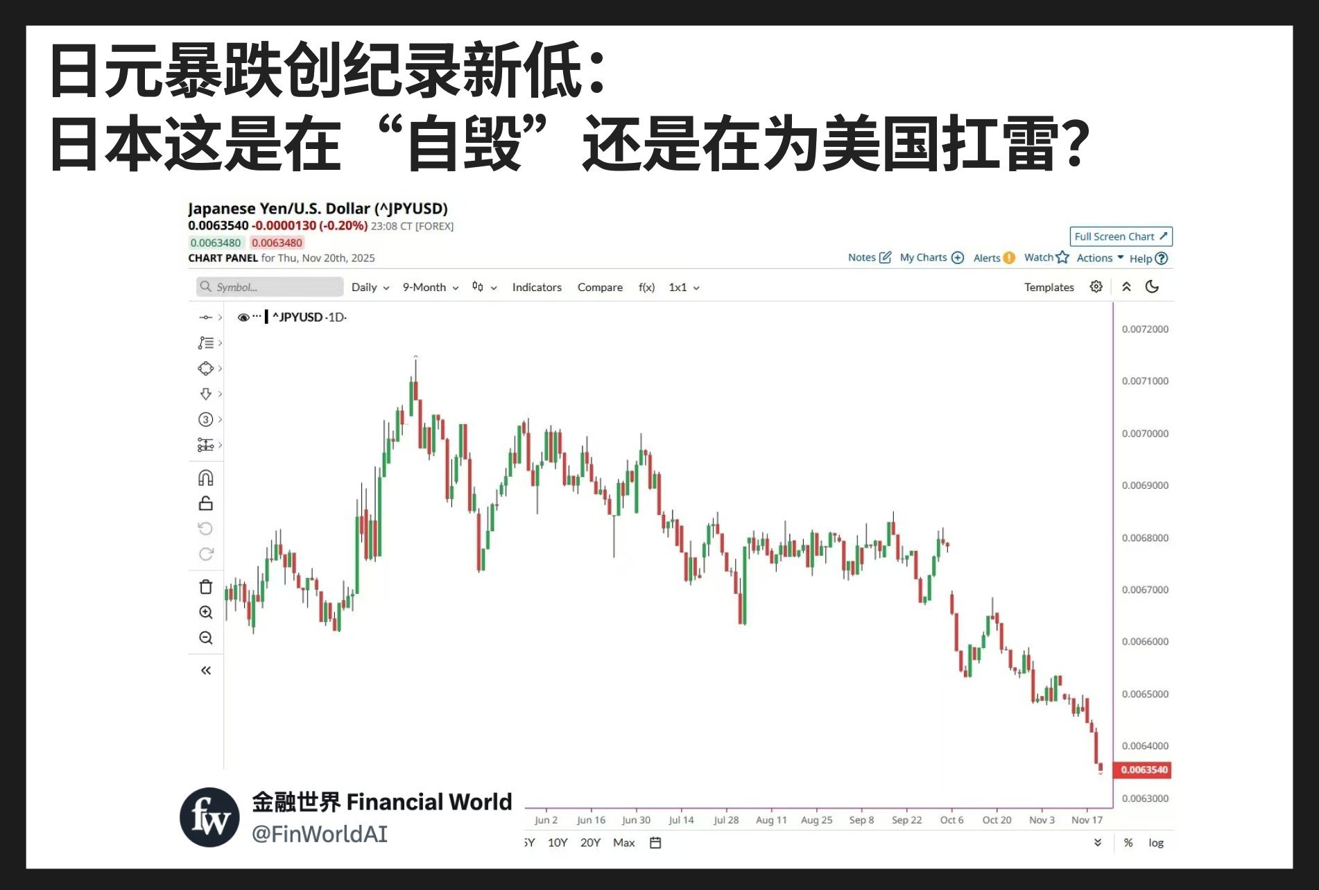 日元汇率再度显著下挫。如图所示近乎垂直的下跌轨迹,已远超常规意义上的贬值,而更接近一种失控式的单边下行。目前日元兑美元汇率已跌至0.0063,刷新阶段性低点,其走势正逐步削弱日元的国际信誉与购买力。日本之所以持续维持宽松货币政策、放任日元走弱,实为多重困境下的被动选择。长期难以控制的通胀水平、长期趋近于零的政策利率,以及高企的政府债务,共同构成其政策困境。一旦启动加息,日本政府债务的利息负担将急剧上升,可能引发财政危机,因而只能继续维持超低利率环境,放任日元承受市场抛压。更具结构性矛盾的是,日元弱势反而强化了美元的强势地位,客观上有利于美国维持低融资成本与资本流入。在全球资本涌向美元资产的背景下,日本某种程度上成为美元信用体系的支撑者,甚至被迫承担系统性代价。日元持续贬值的直接冲击包括:日本民众资产购买力持续萎缩,企业进口成本上升却难以传导至工资增长,外国游客虽因汇率获益而增加消费,本国居民的实际生活水平却在相对下降。与此同时,美日之间的经济权力结构进一步向美国倾斜。总体来看,当一个发达经济体将其货币价值推向通常见于发展中国家的水平,所反映的不仅是政策失灵,更是其结构性困境与方向缺失。日元持续下行,预示着日本经济已逼近必须直面根本问题的临界点。