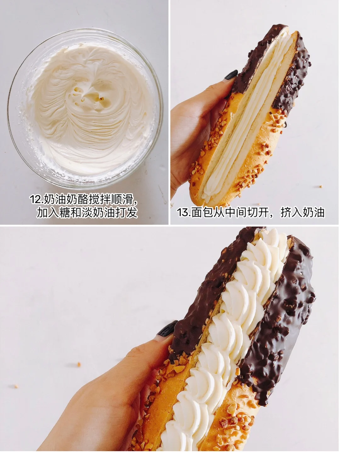 ❼奶油奶酪先搅拌顺滑,加入糖和淡奶油打发;待巧克力凝固后,面包从中间切开,挤入乳酪奶油