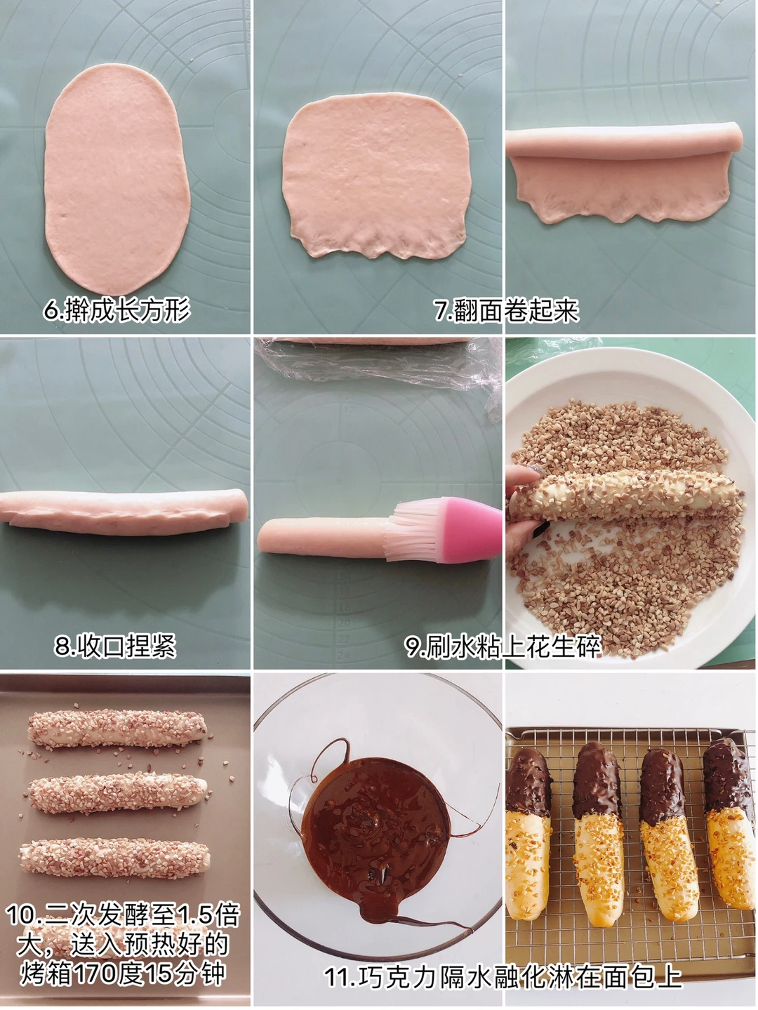 ❹取一个面团擀成长方形卷起来,收口捏紧,刷上水,粘上花生碎(用手轻轻按压一下)摆入烤盘,烤箱35度发酵50分钟至1.5倍大